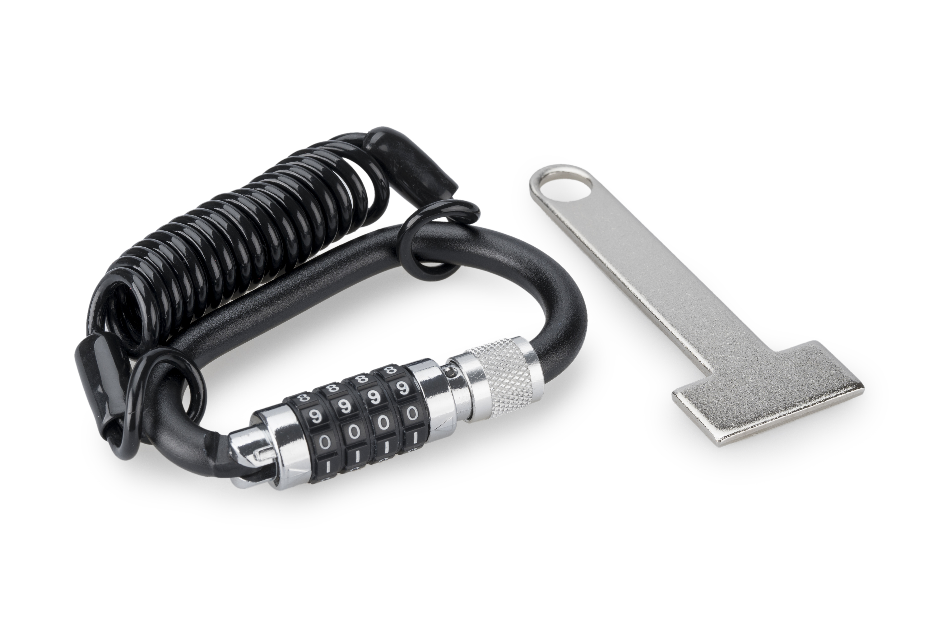 El sistema també inclou un cable d’acer trenat recobert amb una funda plàstica que protegeix tant el casc com la moto de possibles ratllades, mantenint un alt nivell de resistència davant intents de tall. A més, s’acompanya d’una pletina especialment pensada per facilitar el tancament de cascos tipus jet, permetent fixar fins a dues unitats de forma segura.