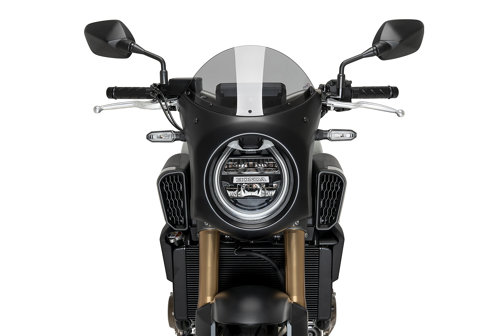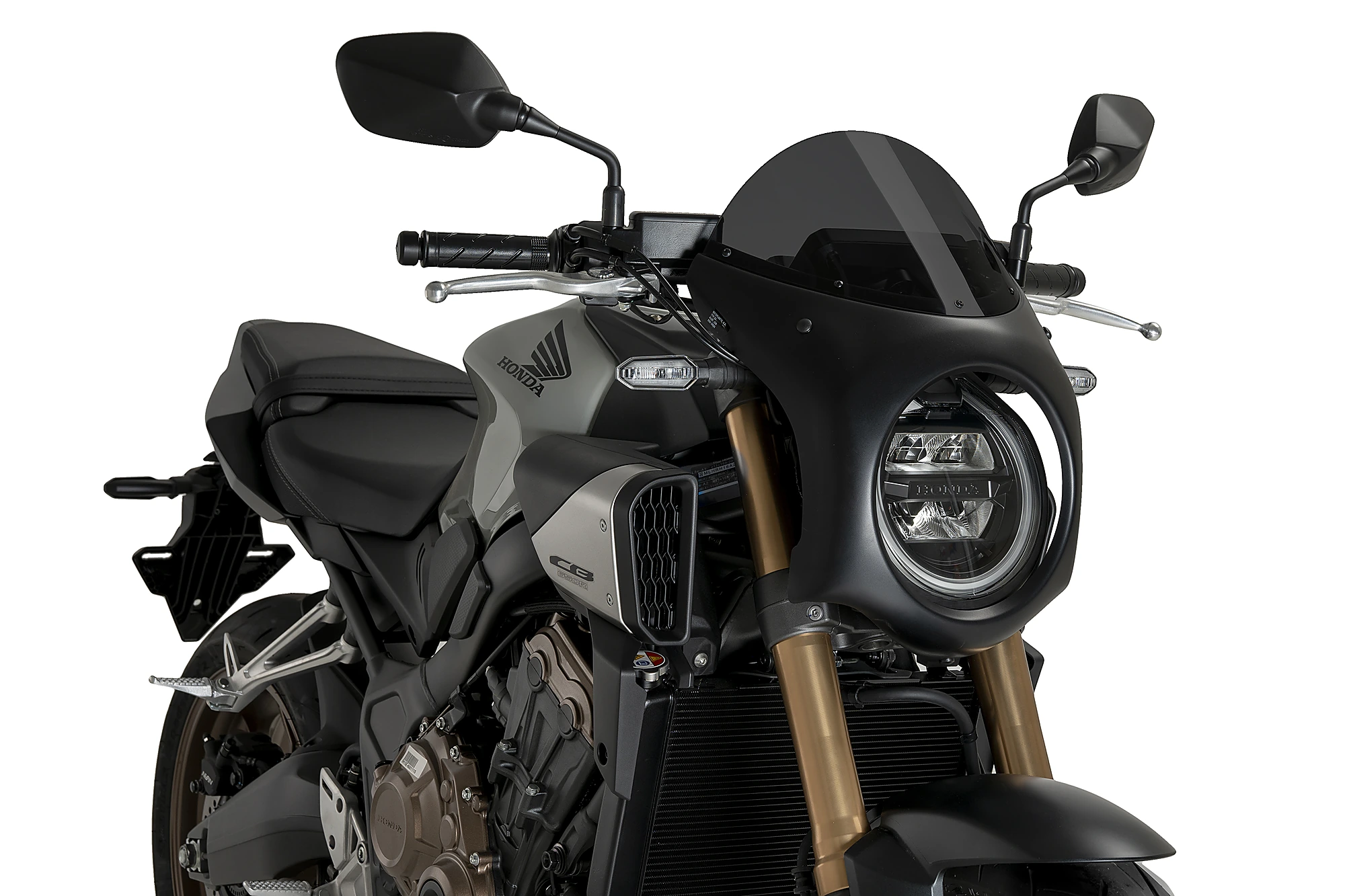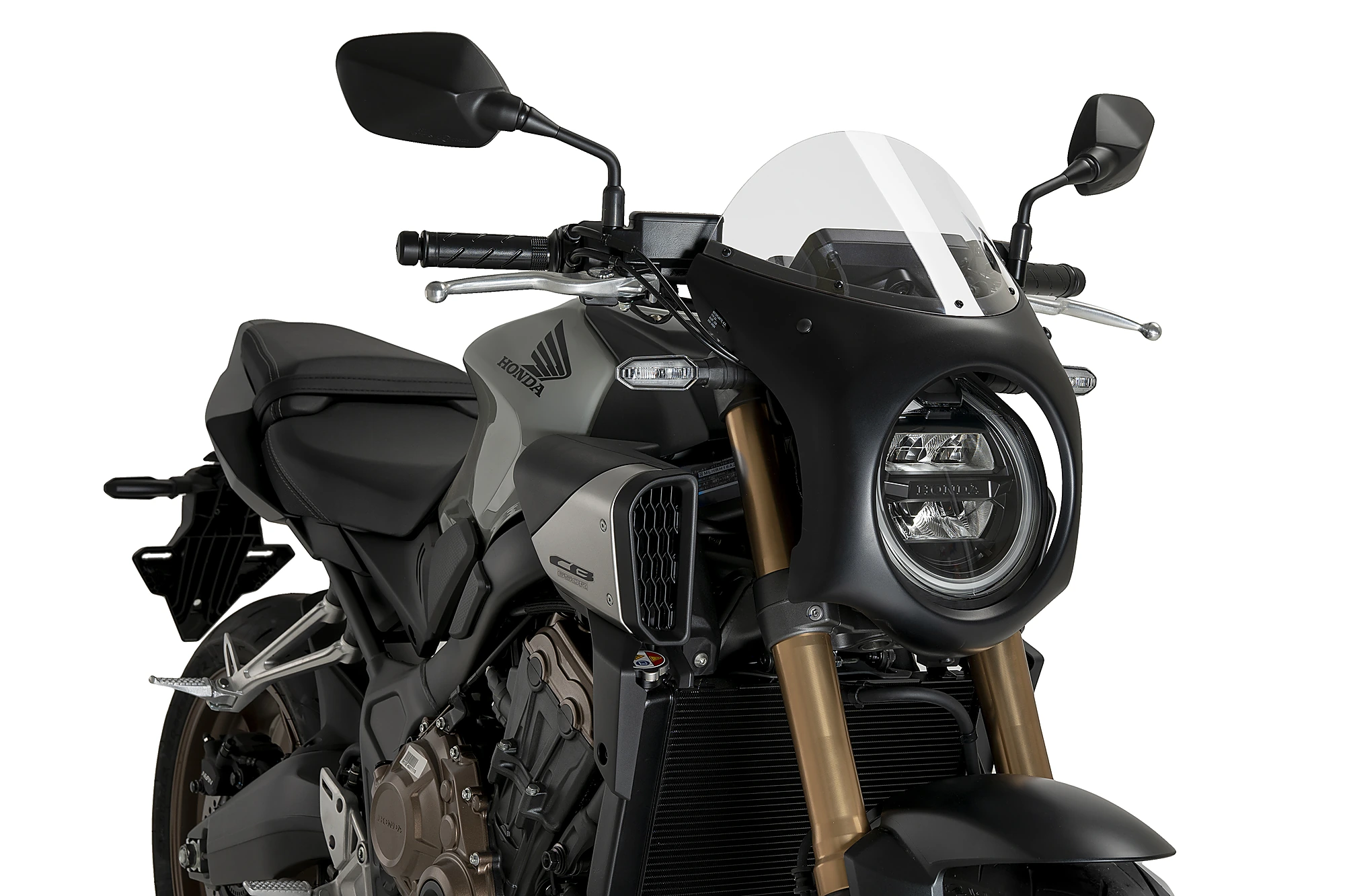 El semicarenat retro ha estat dissenyat per oferir una millor protecció aerodinàmica a la teva Honda CB650R 24’ sense renunciar a l’estètica. El disseny de la peça Puig gira al voltant d’aconseguir una estètica minimalista, encaixant en el far rodó i cobrint tota la instrumentació i part del frontal. Així, es protegeixen aquestes zones de brutícia i possibles objectes o elements que hi impactin.