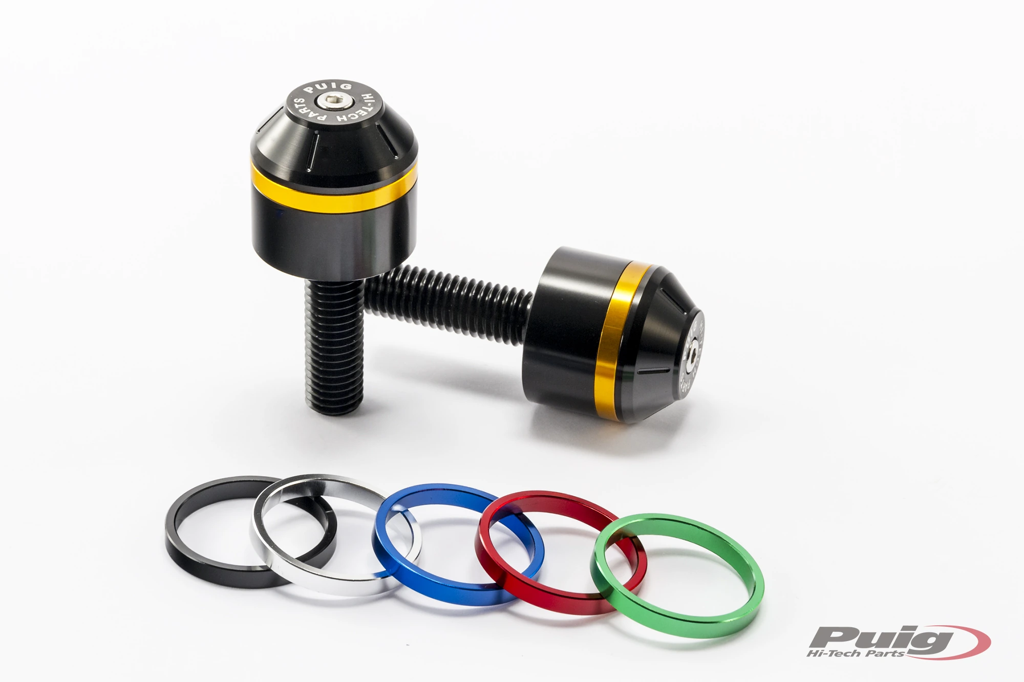 Peça mecanitzada a partir d'un bloc d'alumini (únicament 58 gr de pes i una mesura de 30mm), inclou la particularitat de portar incrustats un cèrcol en els extrems que permetrà donar un toc de color a l'contrapès amb acabat color negre. Pel que fa als cèrcols, Puig serveix un kit de 10 cèrcols (2 per color) per personalitzar al teu gust la moto i inclouen els colors: negre, blau, vermell, plata i or. En cas que vulguem el color verd, aquest únicament se serveix per la referència Ref.8498N (Kawasaki i universal). Cal destacar que els contrapesos es serveixen en parelles. En l'apartat de recanvis, Puig també dóna la possibilitat d'adquirir els cèrcols dels contrapesos.