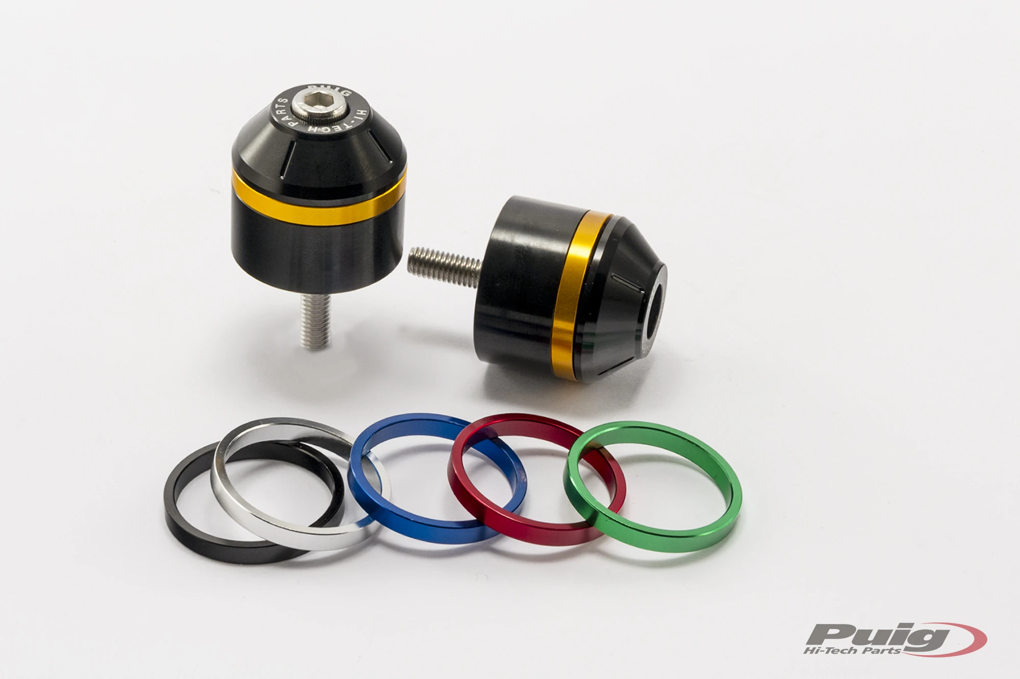 Peça mecanitzada a partir d'un bloc d'alumini (únicament 58 gr de pes i una mesura de 30mm), inclou la particularitat de portar incrustats un cèrcol en els extrems que permetrà donar un toc de color a l'contrapès amb acabat color negre. Pel que fa als cèrcols, Puig serveix un kit de 10 cèrcols (2 per color) per personalitzar al teu gust la moto i inclouen els colors: negre, blau, vermell, plata i or. En cas que vulguem el color verd, aquest únicament se serveix per la referència Ref.8498N (Kawasaki i universal). Cal destacar que els contrapesos es serveixen en parelles. En l'apartat de recanvis, Puig també dóna la possibilitat d'adquirir els cèrcols dels contrapesos.