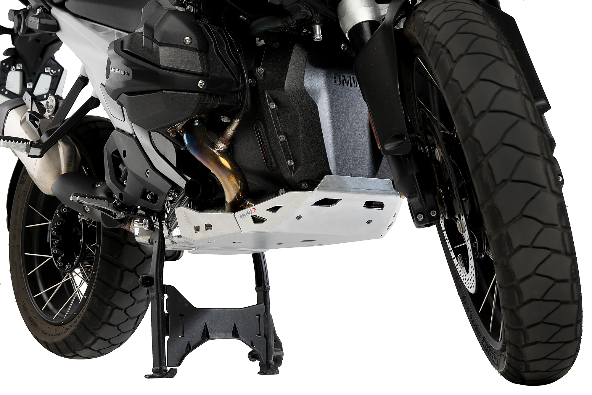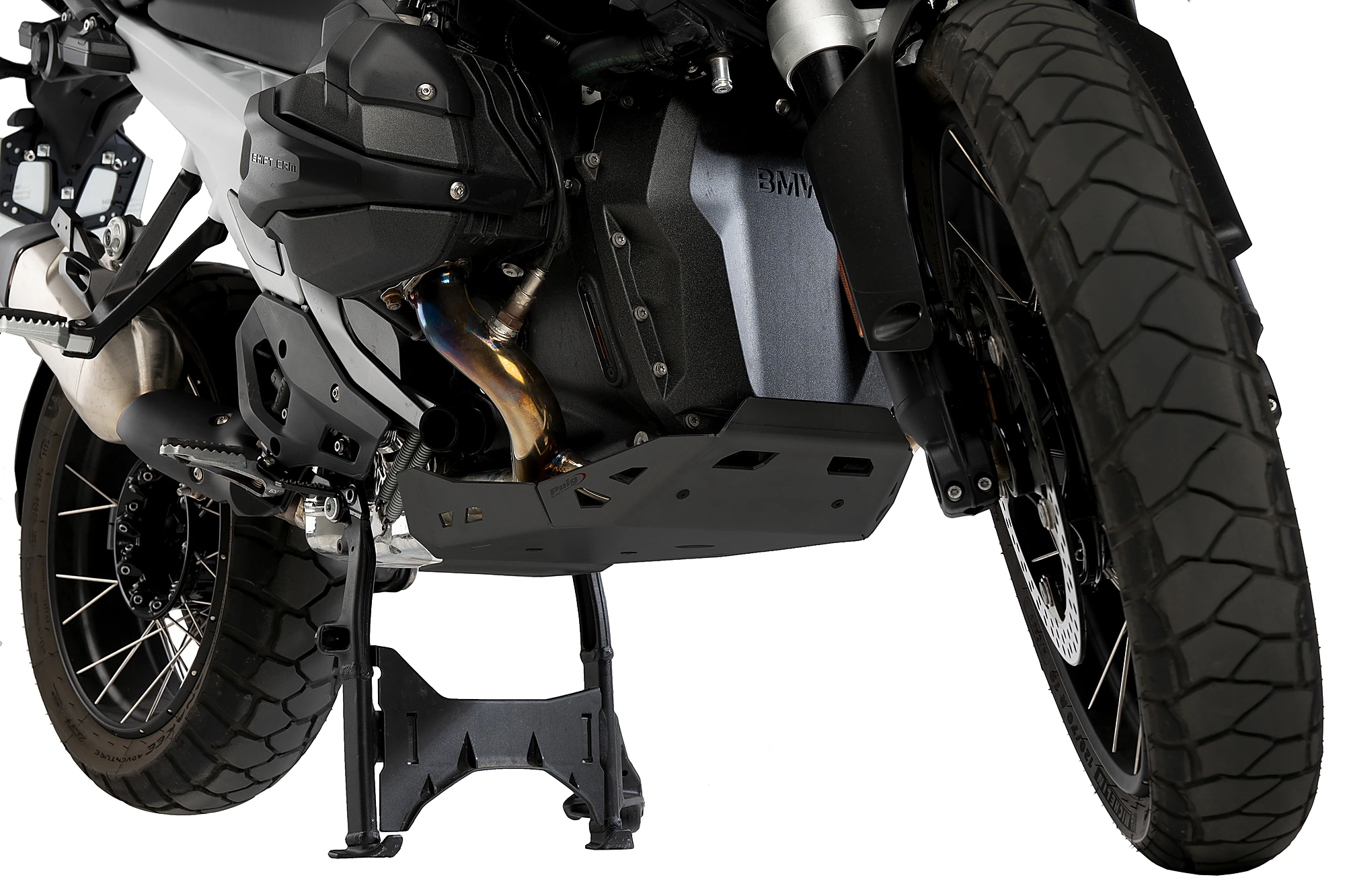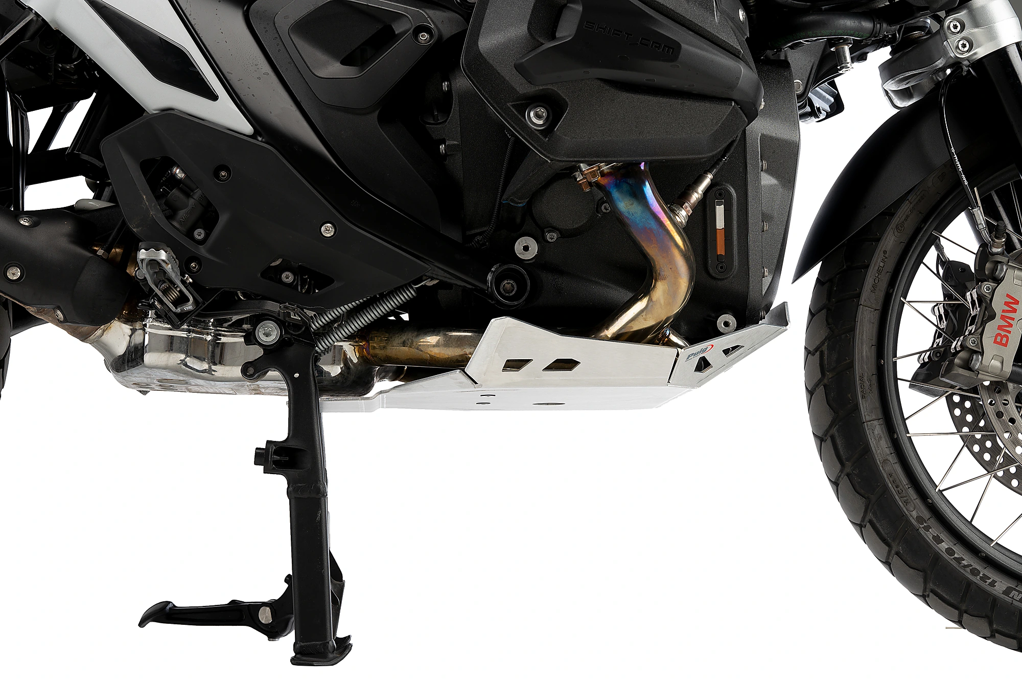 Dissenyada específicament per a la nova versió de la maxitrail alemanya, s'adapta perfectament al cavall central de la moto, augmentant la protecció del tub d'escapament i complementant el protector de carter Puig (Ref.21829).