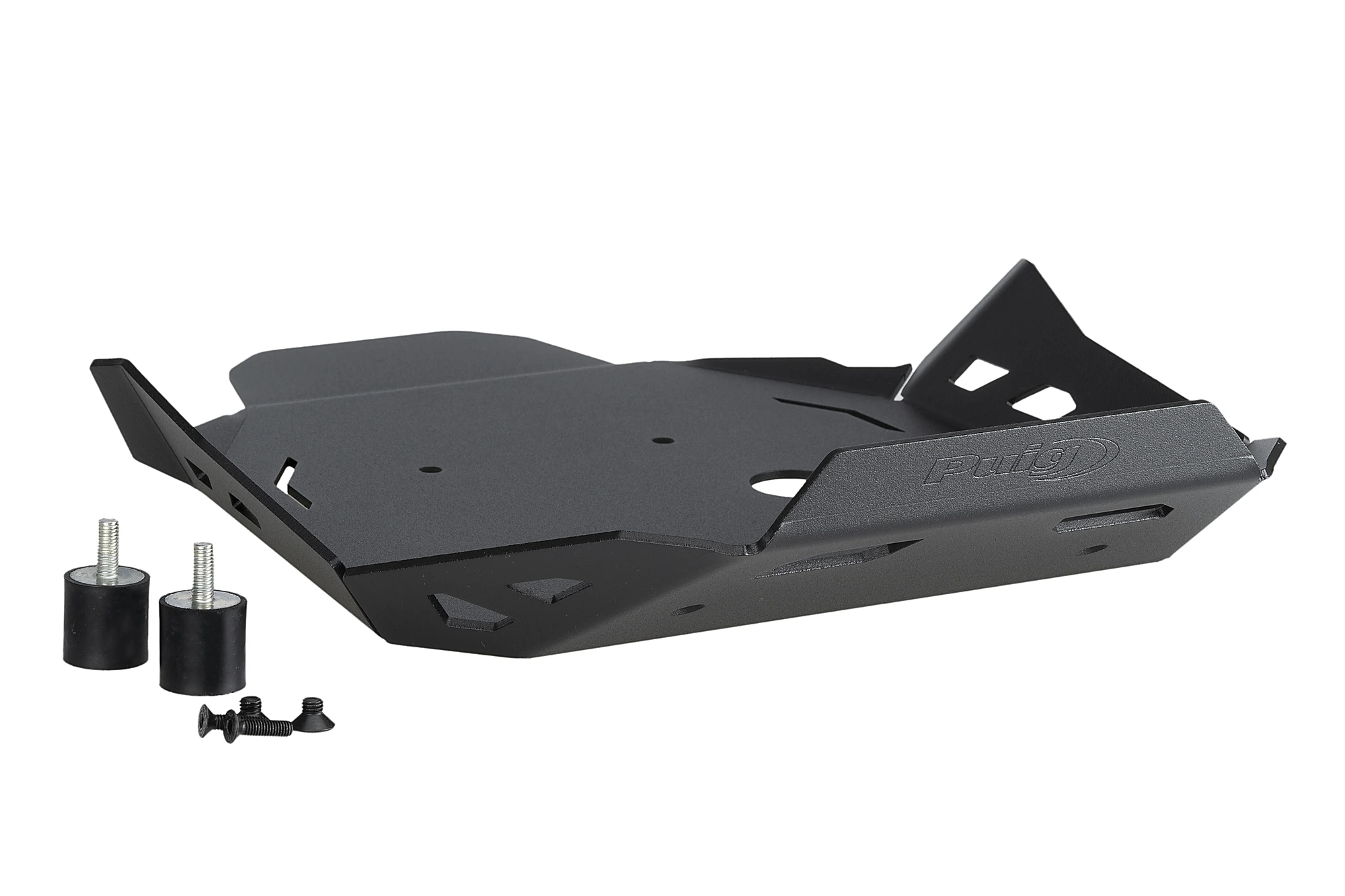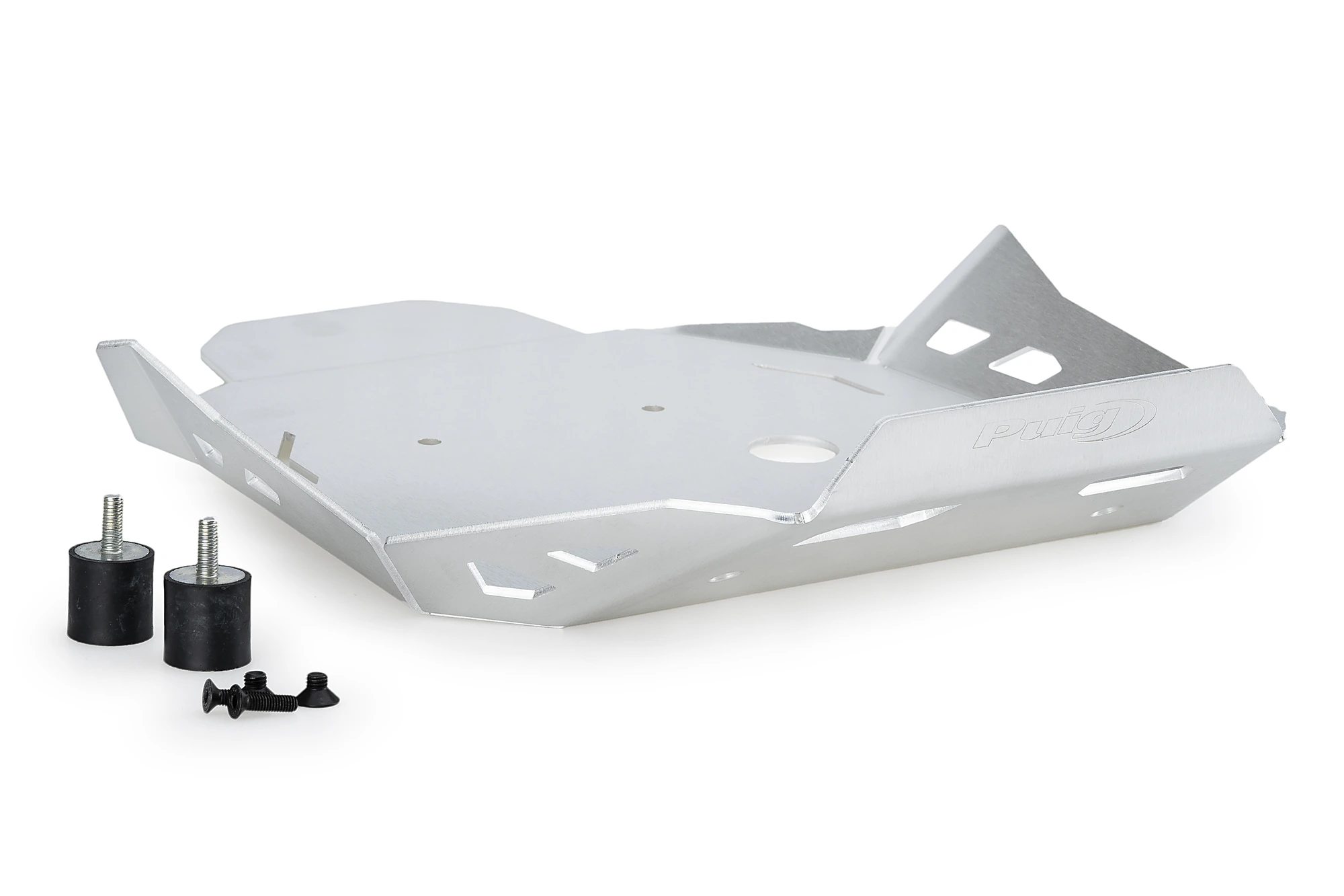 El protector es fixa a la part inferior de la moto amb uns suports de goma antivibracions que absorbeixen els possibles cops que pugui rebre el protector, distribuint la força dimpacte pels diferents punts de fixació i alhora eliminen possibles sorolls molestos que existeixen quan no es fan servir aquestes gomes.