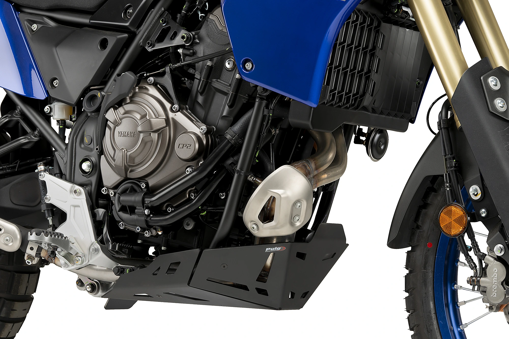 Protegeix els baixos del motor de la Yamaha Tenere 700 amb el protector de càrter de Puig. Amb un disseny senzill però agressiu, el protector de Puig és més llarg que la peça original que substitueix, permetent protegir el catalitzador i la suspensió, zones que, en la pràctica de l’off-road, queden molt exposades. La seva instal·lació millora la protecció de parts sensibles, com els baixos del motor, davant impactes de pedres, fang, etc.