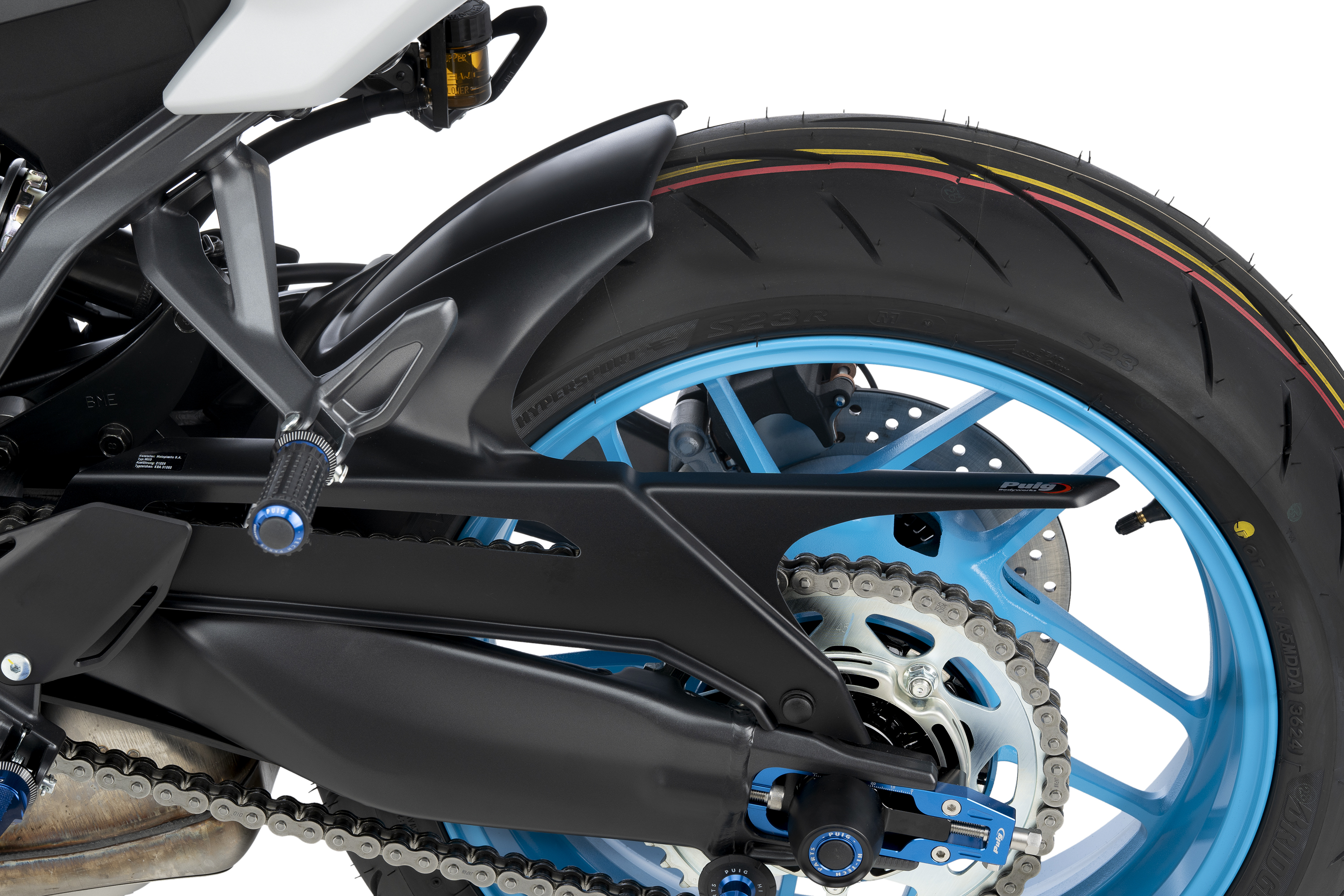 Dank seiner größeren Abmessungen wird die Abdeckung über dem Hinterrad erhöht, wodurch Spritzer oder kleine Stöße im Bereich des Stoßdämpfers, des Radkastens und der Beine des Fahrers und Beifahrers vermieden werden.