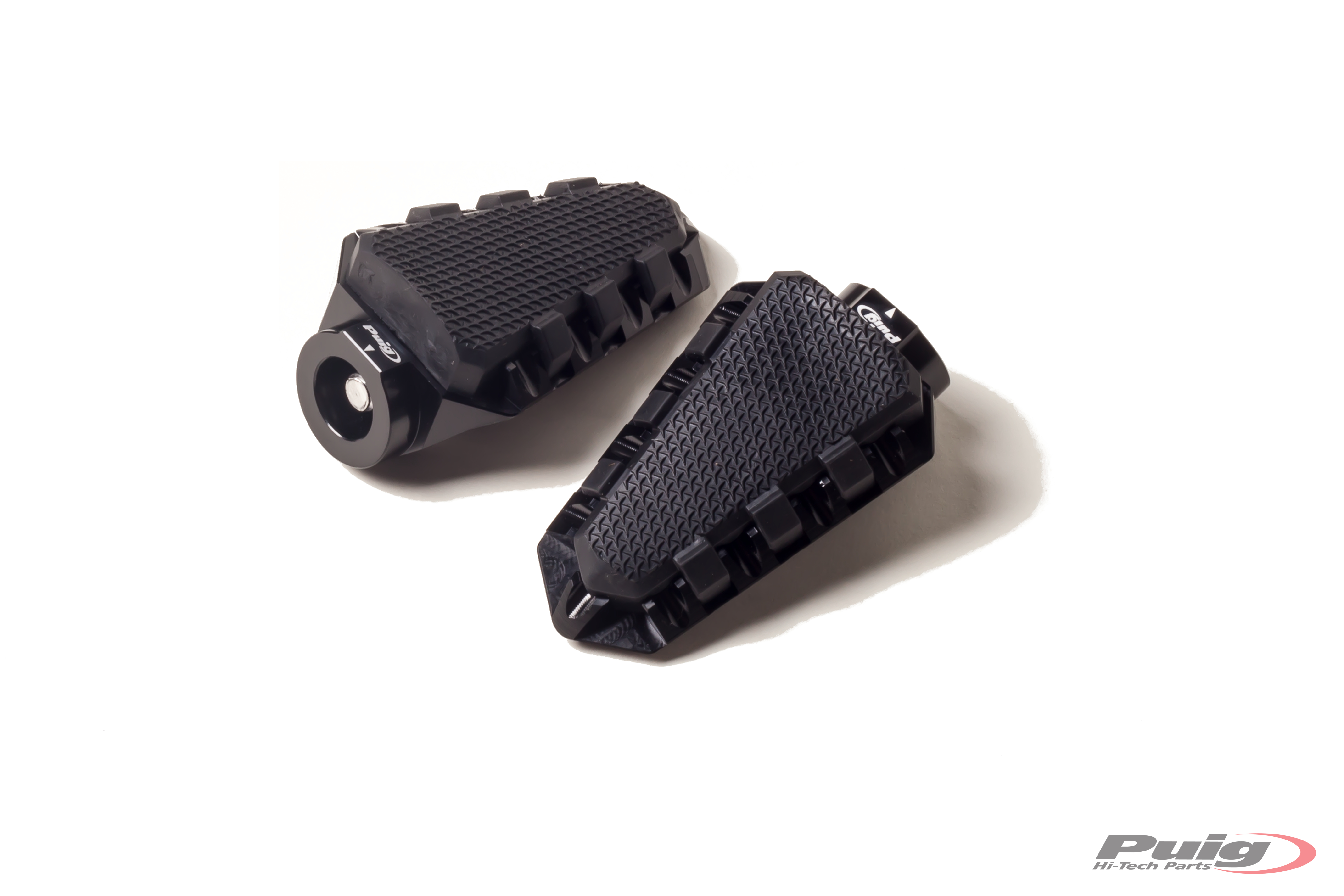 Die Puig Trail-Fußrasten wurden speziell für Tourer-Typ-Motorräder entwickelt und bieten dem Fahrer in allen Situationen maximalen Grip und Komfort. Die Auflageflächer der Füße ist mit Gummi ausgestattet, wodurch sich die Fußrasten einen besseren Gripp haben. Diese Fußrasten bestehen aus eloxiertem Aluminium. Sie zeichnen sich durch ihr modernes und sportliches Design aus, das sich als ideale Komponente für die vielseitigsten Motorräder sowie einer spiegelung des Charakters des Rades eignet.