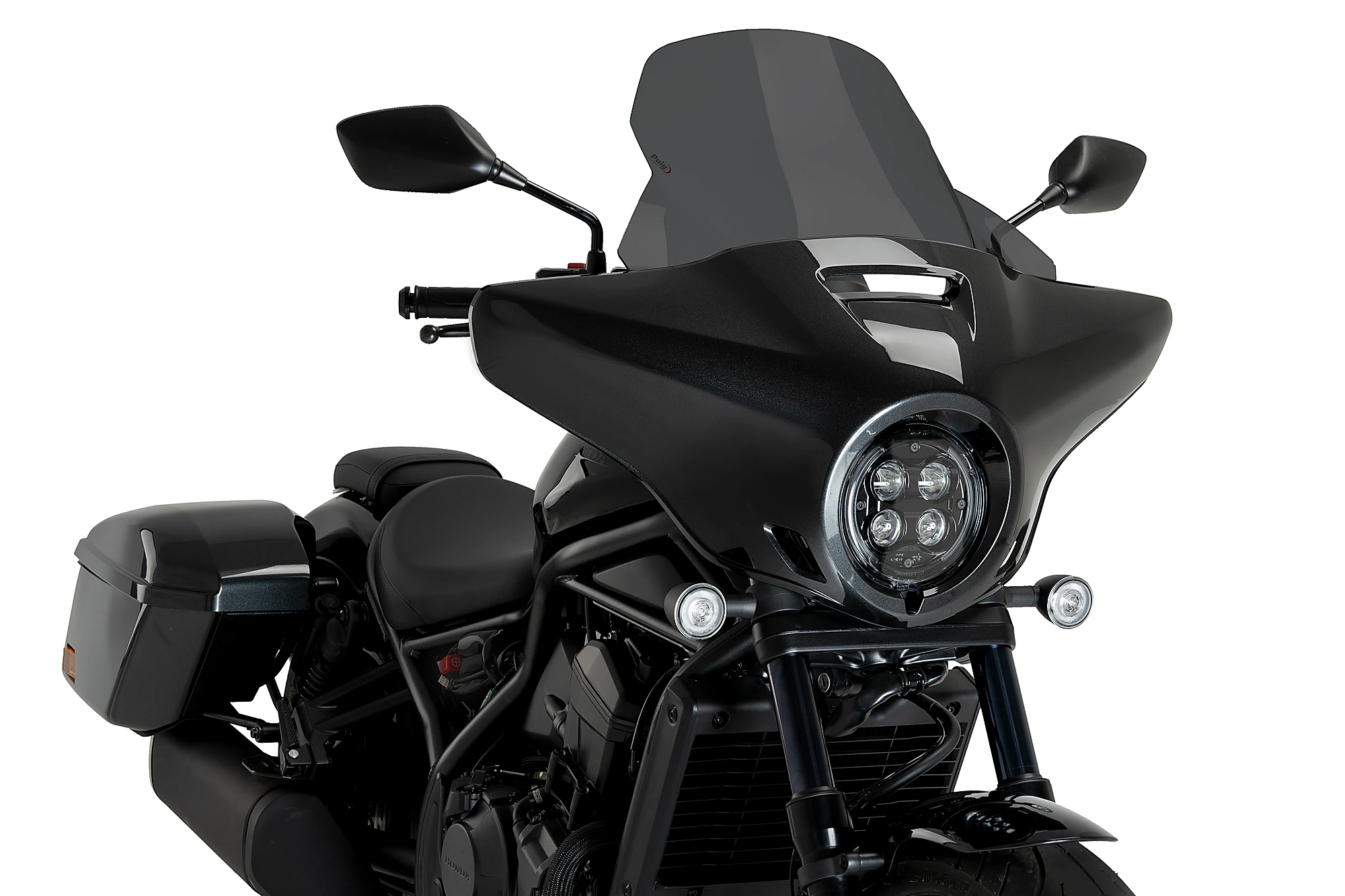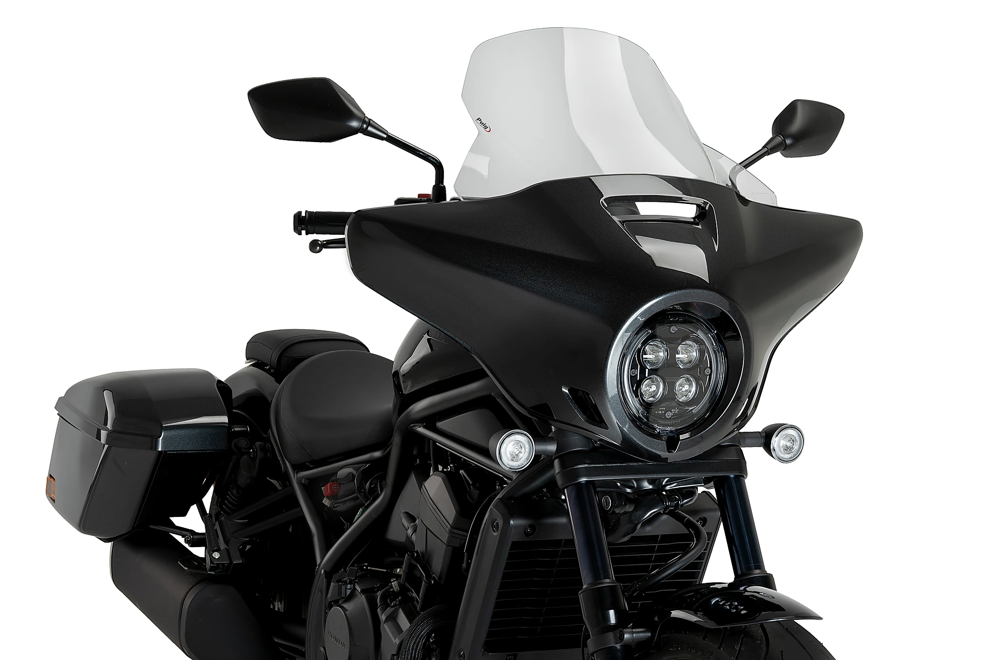 Entwickelt, um den aerodynamischen Schutz des Fahrers zu erhöhen und gleichzeitig die attraktive individuelle Ästhetik der Honda Rebel CMX 1100 T 23'- beizubehalten. Die eleganten und sportlichen Linien der Tourenscheibe integrieren sich perfekt in die Halbverkleidung im Batwing-Stil, die diese Version des Honda Rebel enthält.