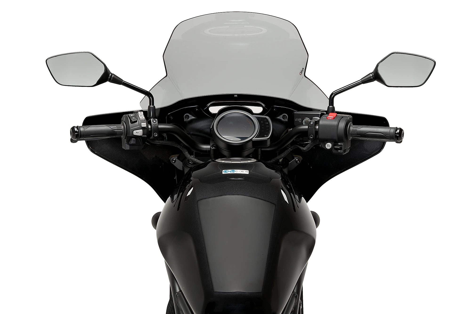 Die seitlichen Formen der Tourenscheibe wurden so gestaltet, dass die Luft, die in den Schulterbereich gelangen würde, besser abgelenkt wird, um einen störenden Luftstrom für den Fahrer zu vermeiden. Die Oberseite ist flach, um eine bessere Durchsicht zu gewährleisten. Daher ist es ideal für lange Strecken, große Fahrer oder Fahrten bei widrigen Wetterbedingungen.