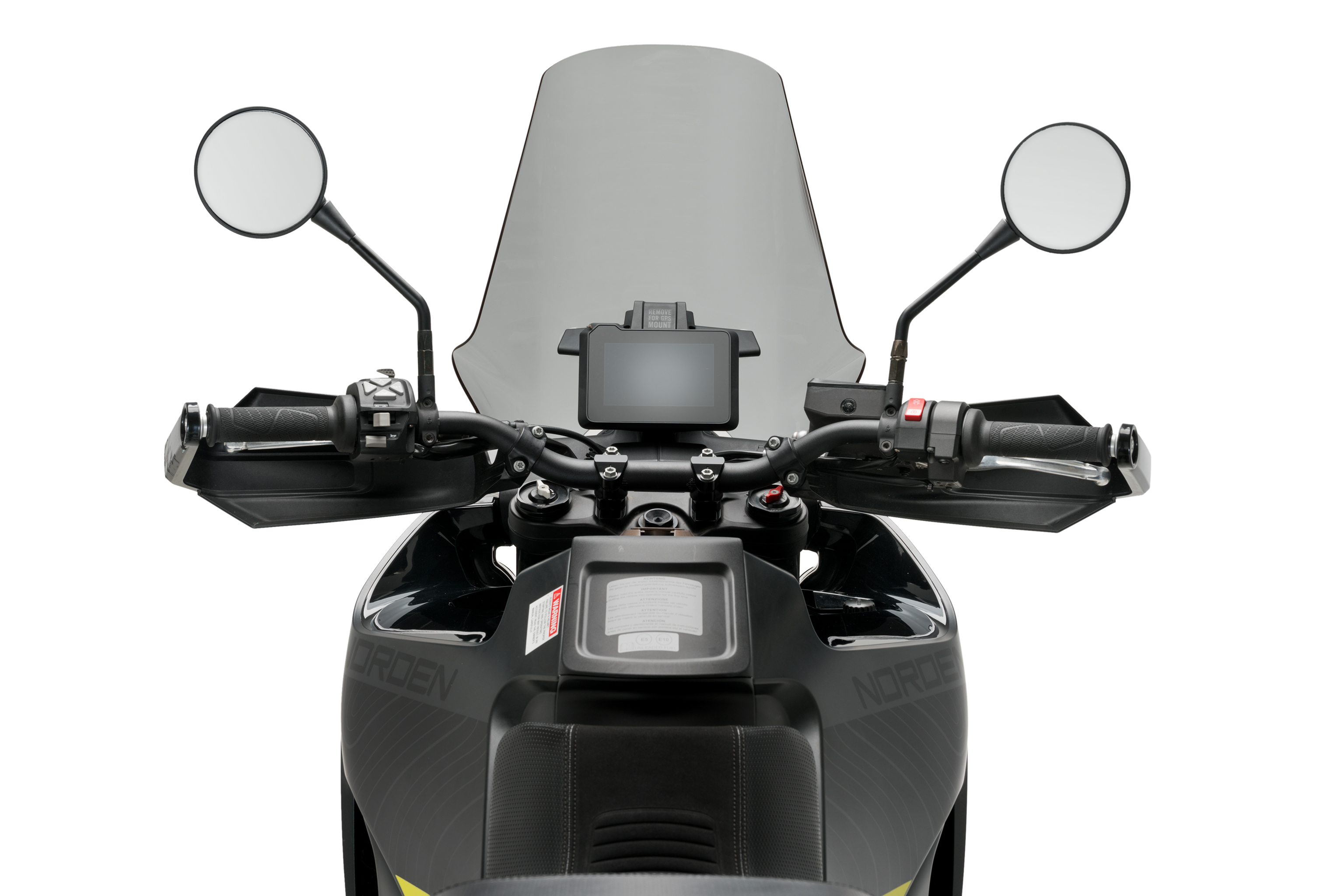 Mit Gesamtabmessungen von 425 mm Breite und 510 mm Höhe ist die Puig Touring-Scheibe 155 mm höher als die ursprüngliche Husqvarna Norden'22-Scheibe. Es ist kompatibel mit den originalen Handprotektoren und mit mehrfach verstellbaren Visieren.