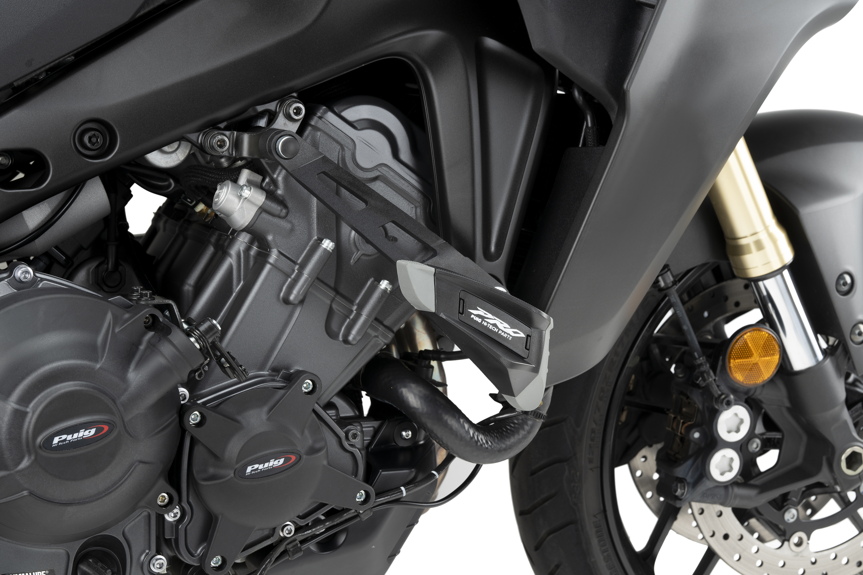 Er besteht aus einem zentralen Körper aus Polyamid (schlag- und abriebfest) und zwei Teilen (vorne und hinten) aus thermoplastischem Elastomer, um mögliche Stöße mit dem Fahrer zu absorbieren.