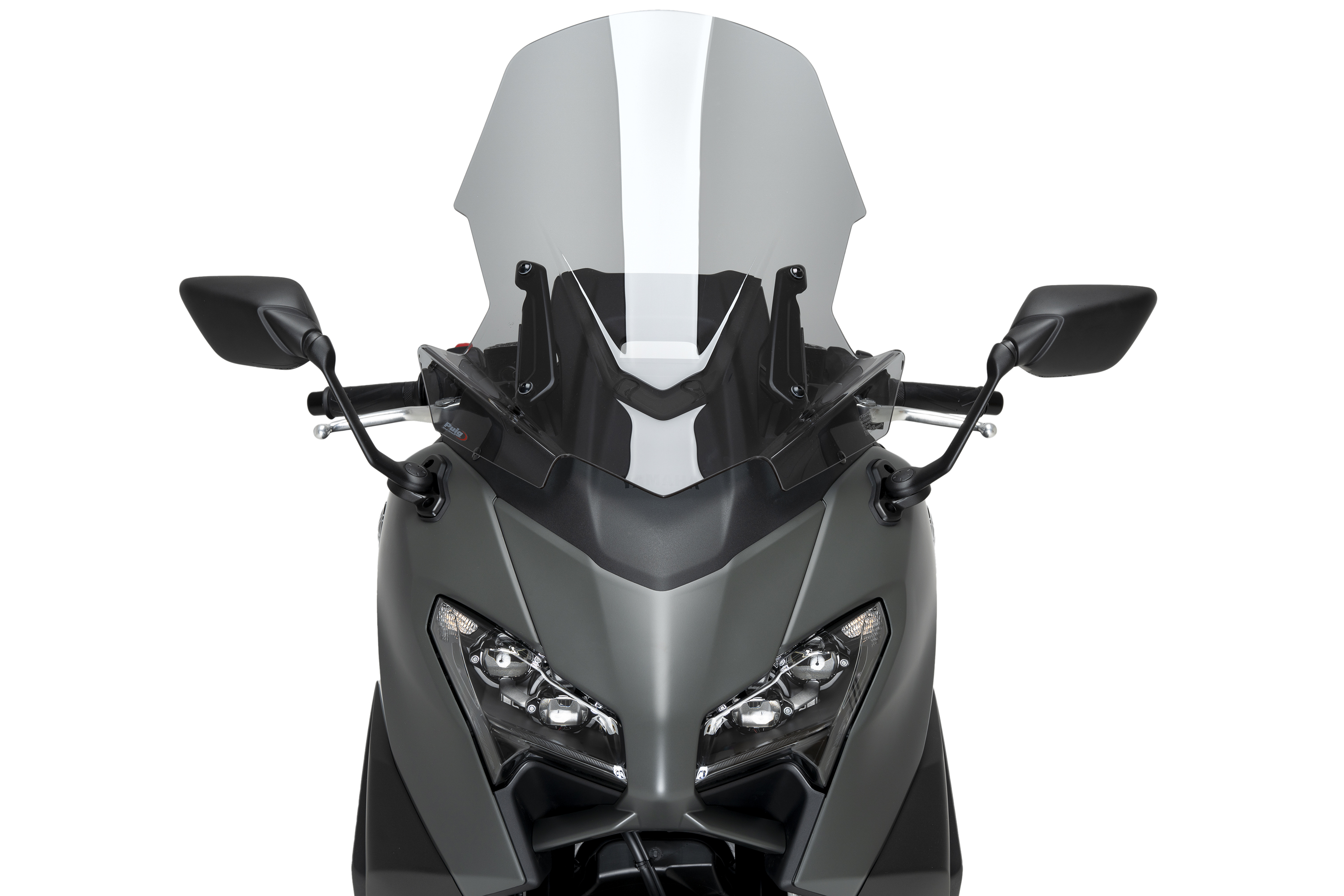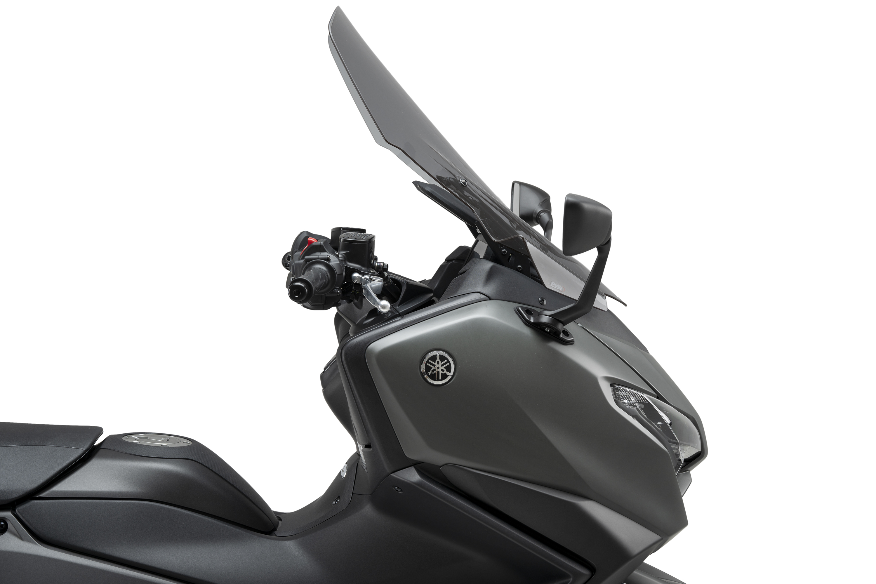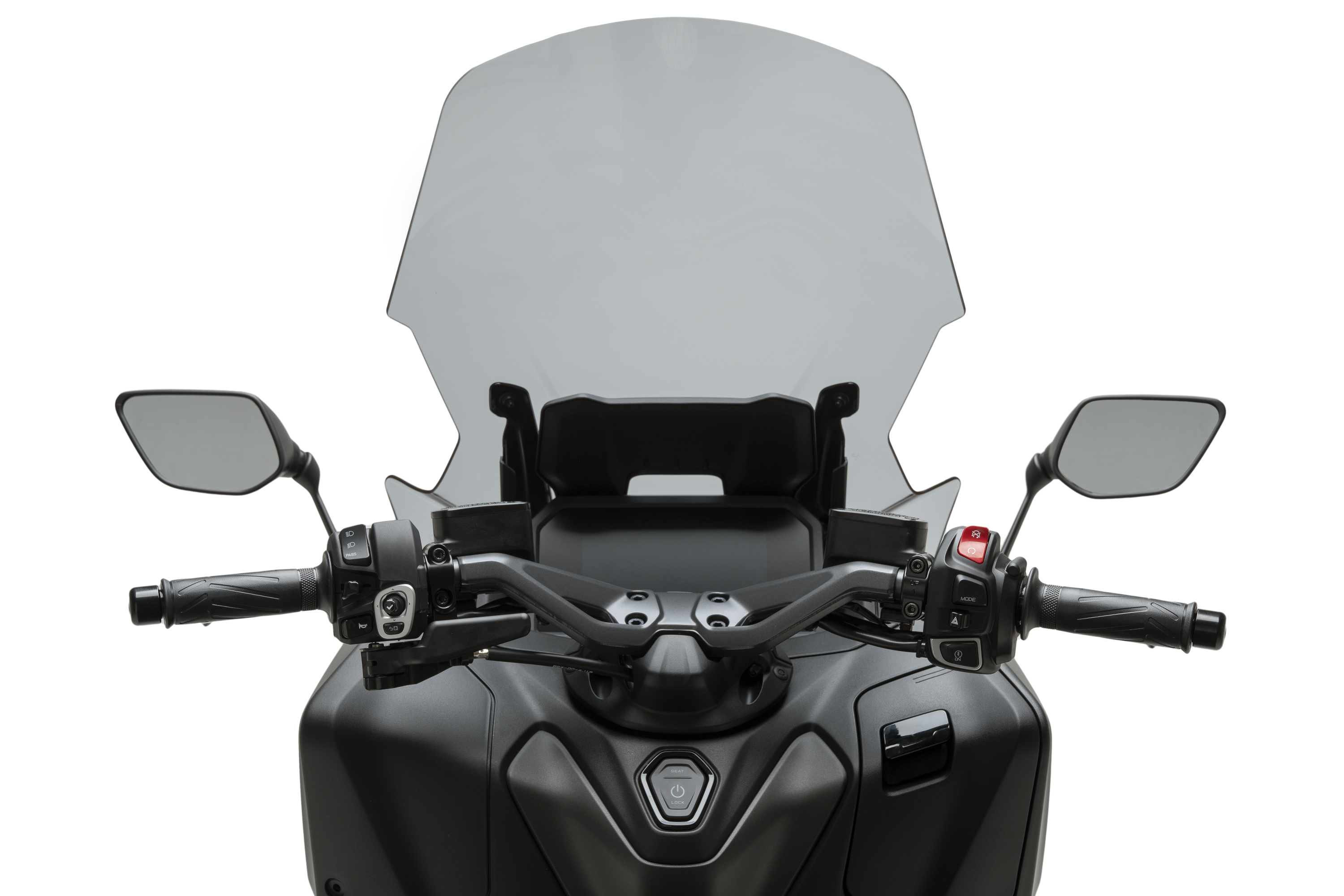Er wurde entwickelt, um einen besseren aerodynamischen Schutz zu bieten, dank seiner Formen, die mit der Technologie des virtuellen Windkanals untersucht wurden, und verfügt über Handabweiser an den Seiten, die die Luft ableiten, die auf die Hände und Arme des Fahrers treffen würde. Gleichzeitig passt sein modernes und elegantes Design perfekt zu den Linien des Yamaha T-Max / Tech Max 22', wodurch eine perfekte Balance zwischen Ästhetik und Funktionalität erreicht wird.