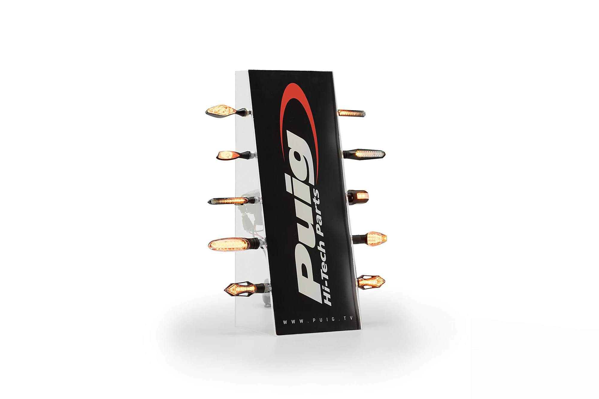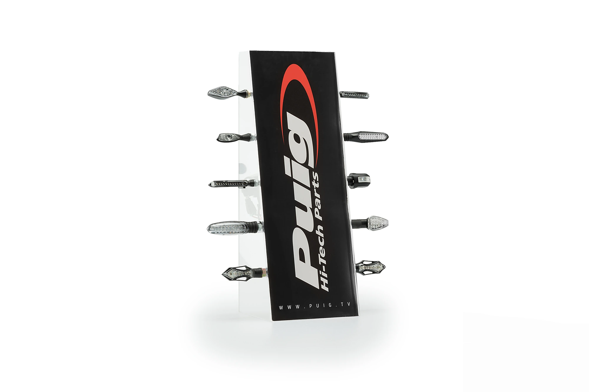 The new turn light exhibitor from Puig has the capacity to place 10 different models of turn signals in a compact and common space. In this way, the customer can appreciate and compare which model best suits their needs just by glancing at the display.