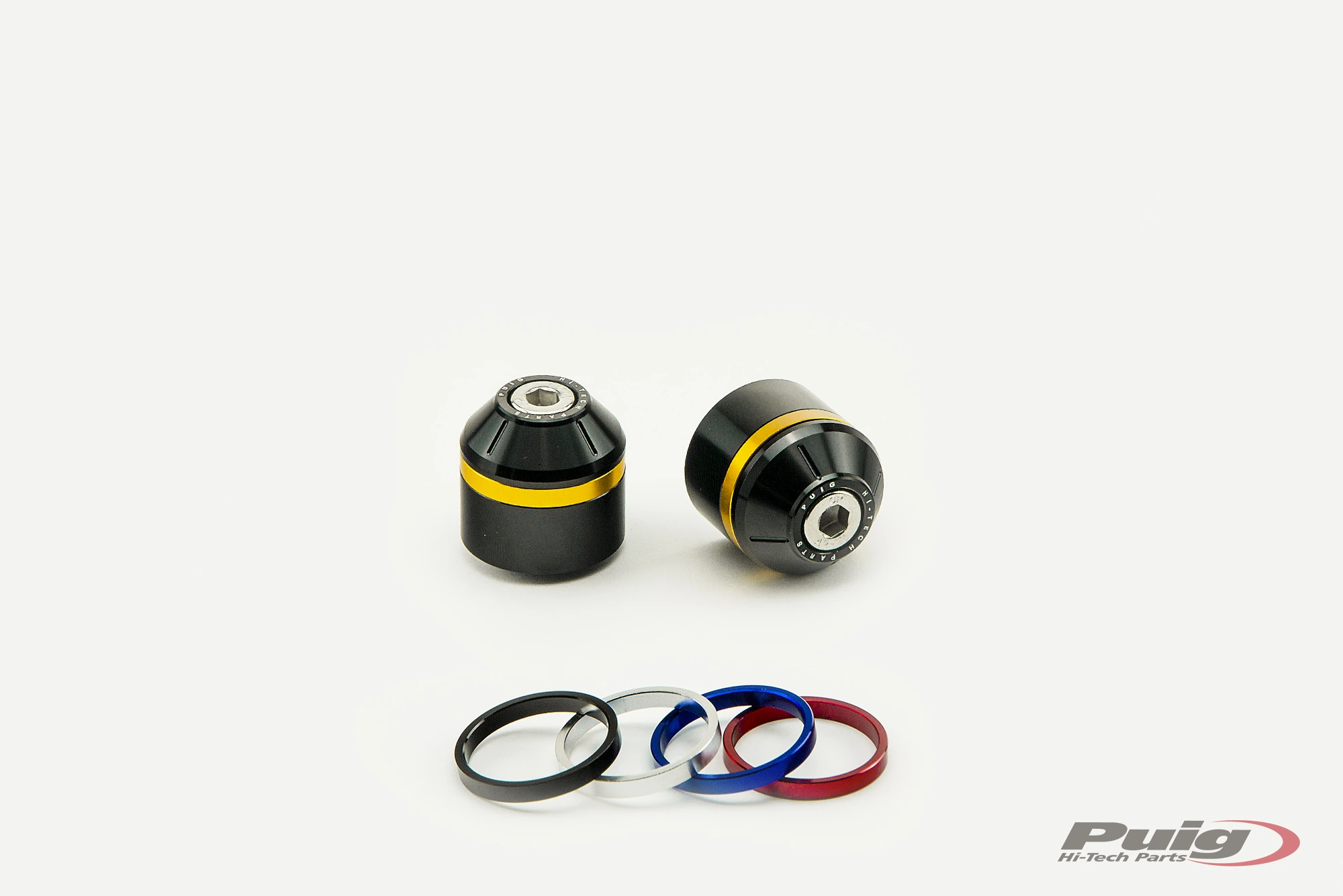 The piece is machined from billet aluminium (only 58g in weight and it measures 30mm), includes the particularity of having a rim embedded in the ends that will give a touch of color to the counterweight with a black finish. Regarding the hoops, PUIG offers a kit of 10 rings total (2 per color) to customize the motorcycle to your liking and includes the colors: black, blue, red, silver and gold. In case you want the green color, this is only used for reference Ref.8498N (Kawasaki and universal). It should be noted that the counterweights are offered in pairs. In the section of spare parts, PUIG also offers the possibility of acquiring the hoops of the counterweights.