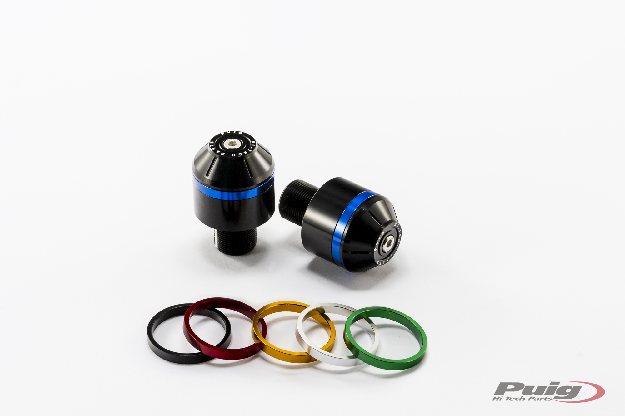 The piece is machined from billet aluminium (only 58g in weight and it measures 30mm), includes the particularity of having a rim embedded in the ends that will give a touch of color to the counterweight with a black finish. Regarding the hoops, PUIG offers a kit of 10 rings total (2 per color) to customize the motorcycle to your liking and includes the colors: black, blue, red, silver and gold. In case you want the green color, this is only used for reference Ref.8498N (Kawasaki and universal). It should be noted that the counterweights are offered in pairs. In the section of spare parts, PUIG also offers the possibility of acquiring the hoops of the counterweights.