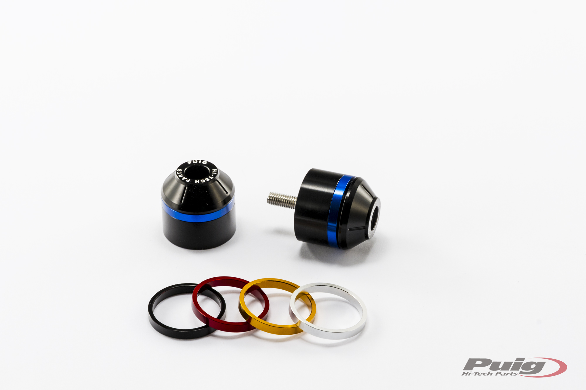 The piece is machined from billet aluminium (only 58g in weight and it measures 30mm), includes the particularity of having a rim embedded in the ends that will give a touch of color to the counterweight with a black finish. Regarding the hoops, PUIG offers a kit of 10 rings total (2 per color) to customize the motorcycle to your liking and includes the colors: black, blue, red, silver and gold. In case you want the green color, this is only used for reference Ref.8498N (Kawasaki and universal). It should be noted that the counterweights are offered in pairs. In the section of spare parts, PUIG also offers the possibility of acquiring the hoops of the counterweights.