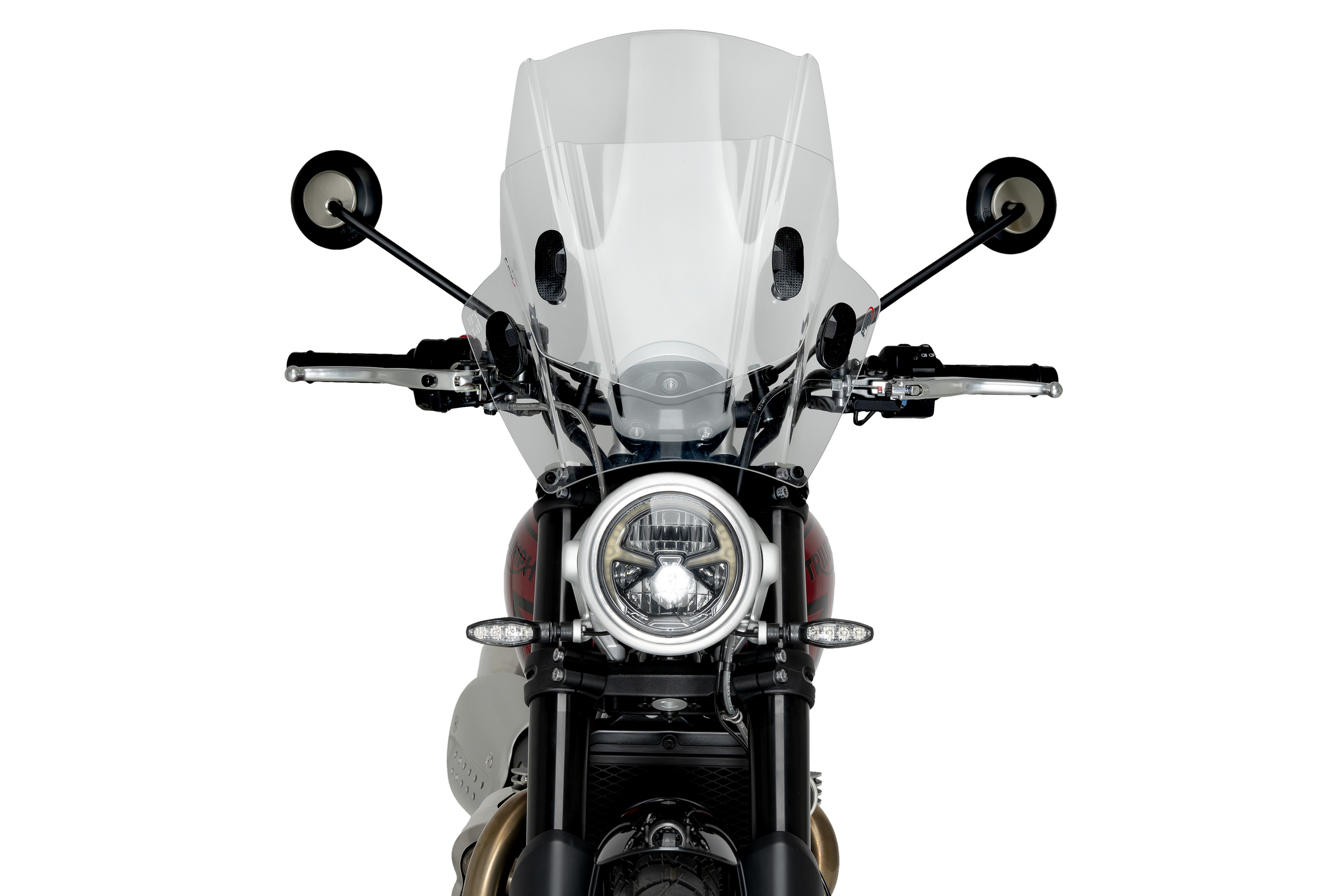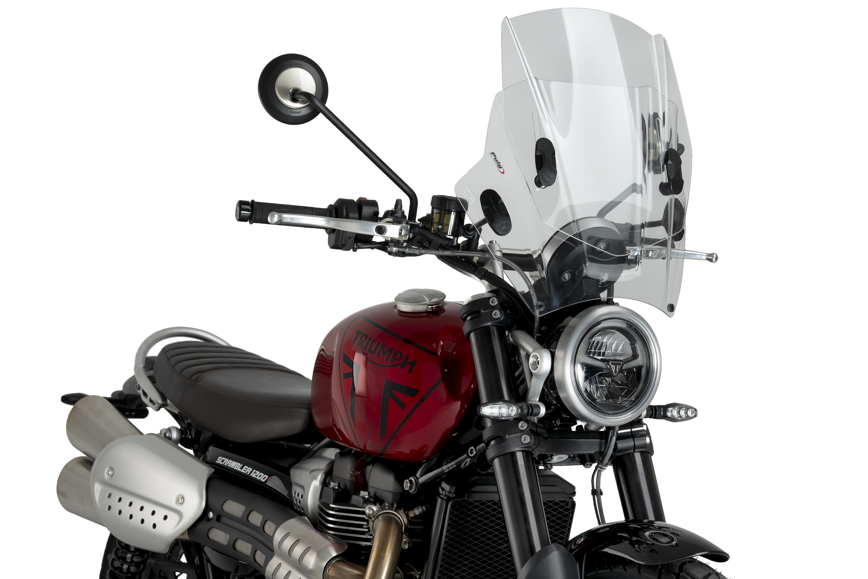 Renew the image of your motorcycle with a round headlight, with Puig’s innovative Up & Down bike windshield. Manufactured in 3mm high impact acrylic material that makes it highly resistant to impacts and strong against the inclemencies of the weather, this product stands out for its versatile design and for its easy assembly, but above all for the two screens that come together, which they allow it to regulate the height of the fairing providing total protection from the wind.