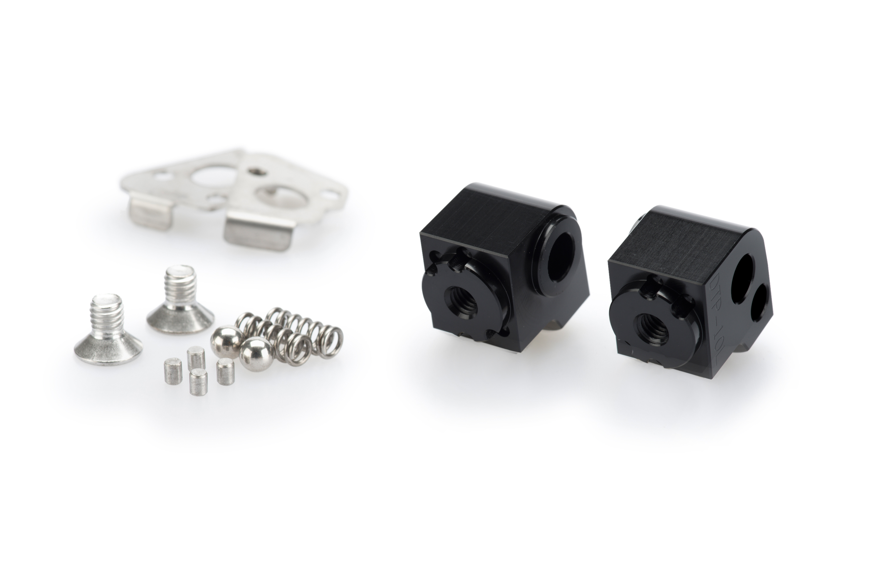 20mm relocation brackets. This offset along with the adjustable footpeg adaptor allows you to move the footpeg relative to the original position in a 20mm radius and at 15 degrees intervals.