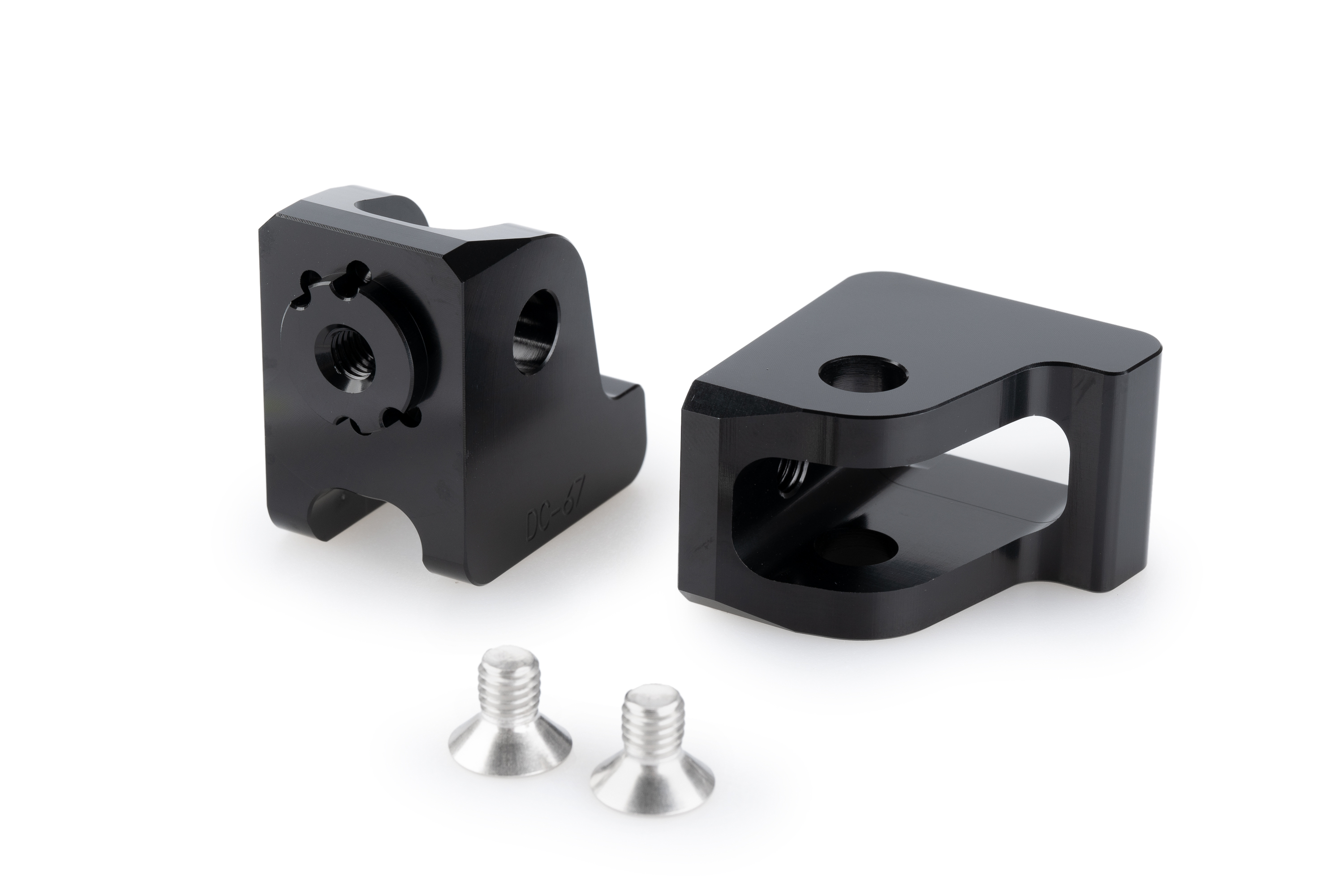 20mm relocation brackets. This offset along with the adjustable footpeg adaptor allows you to move the footpeg relative to the original position in a 20mm radius and at 15 degrees intervals.