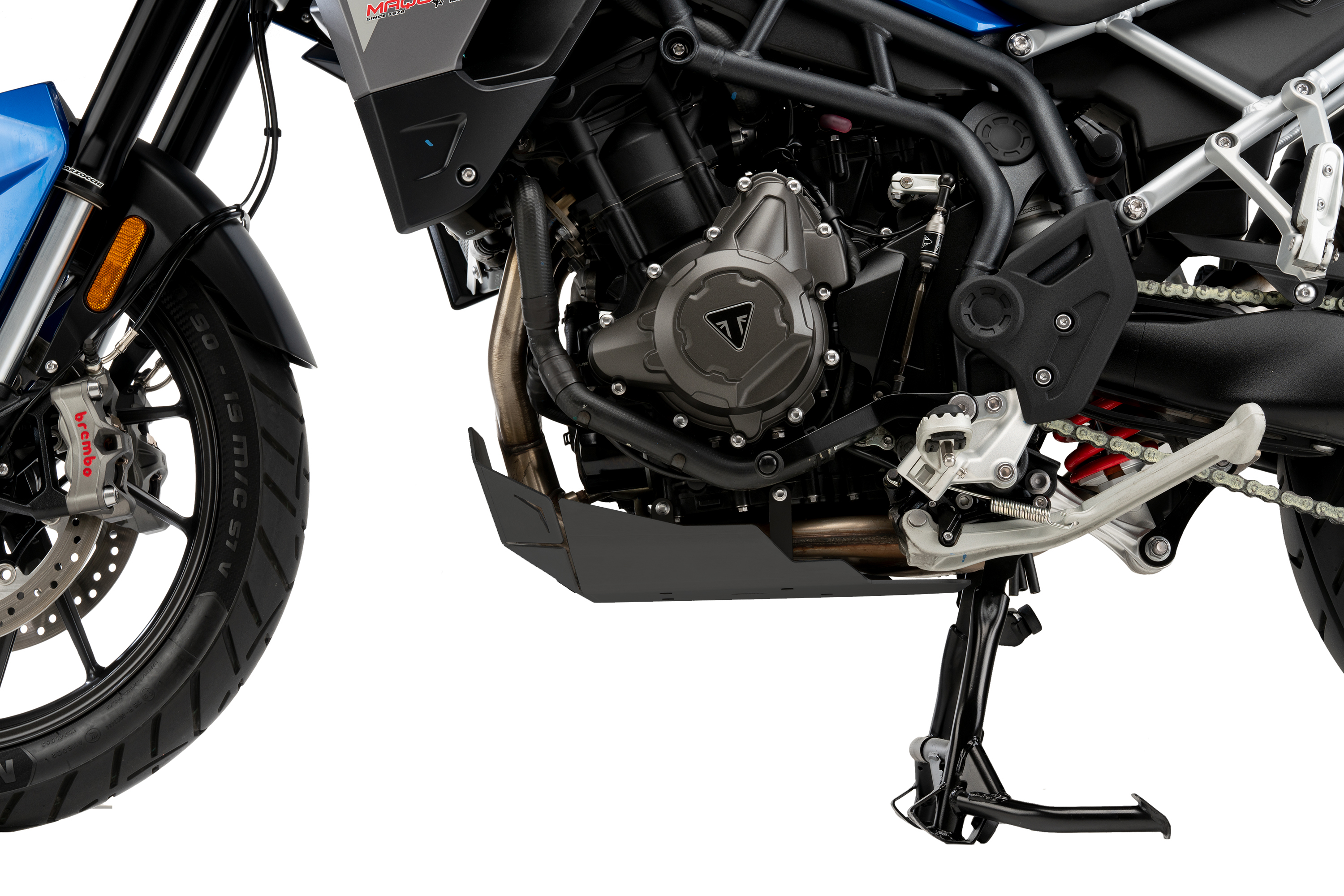 Puig's protective plate is longer than the OEM accessory mounted on the English trail, extending coverage to the catalytic converter area. Sturdy yet lightweight due to the quality of its materials, Puig's oil-carter protector features a simple and aggressive design that adds a more personalized and adventurous look to the Tiger 900.