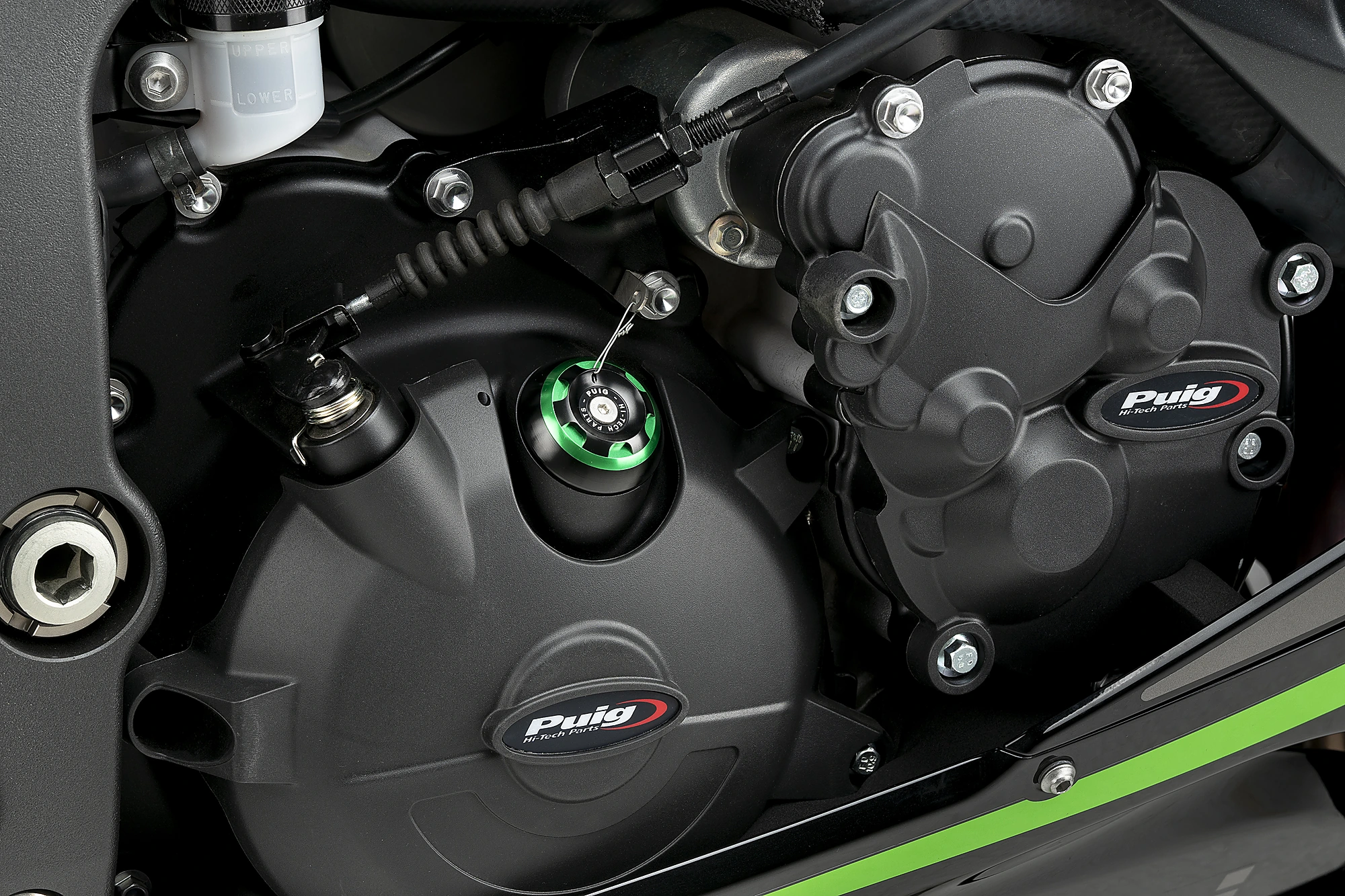 From a purely functional original part to a design part that stands out in the engine assembly. The marked racing character, due to its reduced dimensions and machining lines, is joined by the elegance of a black anodized set and a colored ring that allows it to blend in with the rest of the motorcycle.