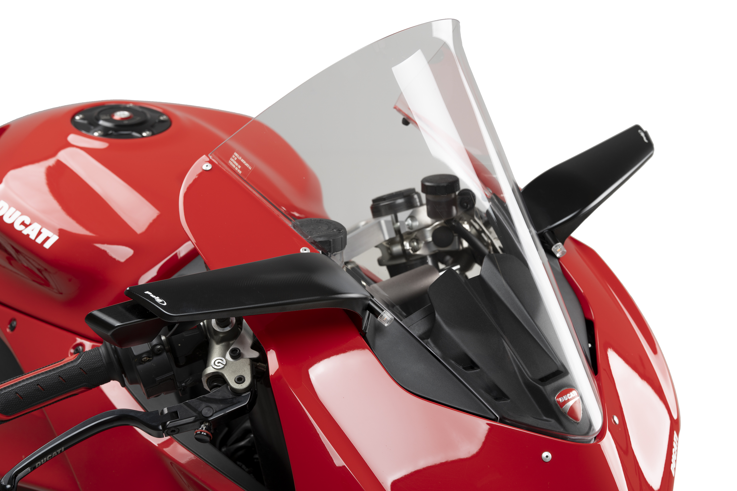 The spoiler-mirror has been developed with virtual wind tunnel technology thanks to Puig's extensive experience in top competitions such as the MotoGP and SBK World Championships, inspired by the latest advances in the field of aerodynamics. It is machined from a block of aluminum and has an elegant black anodizing for a great finish.