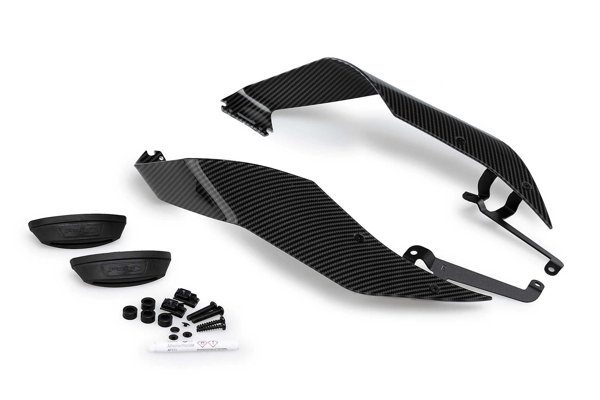 Puig's Downforce Race side spoilers are available in various colors; glossy black, matte black, dark smoke, blue, and carbon finish for those looking for an even more racing look for the Yamaha R7.