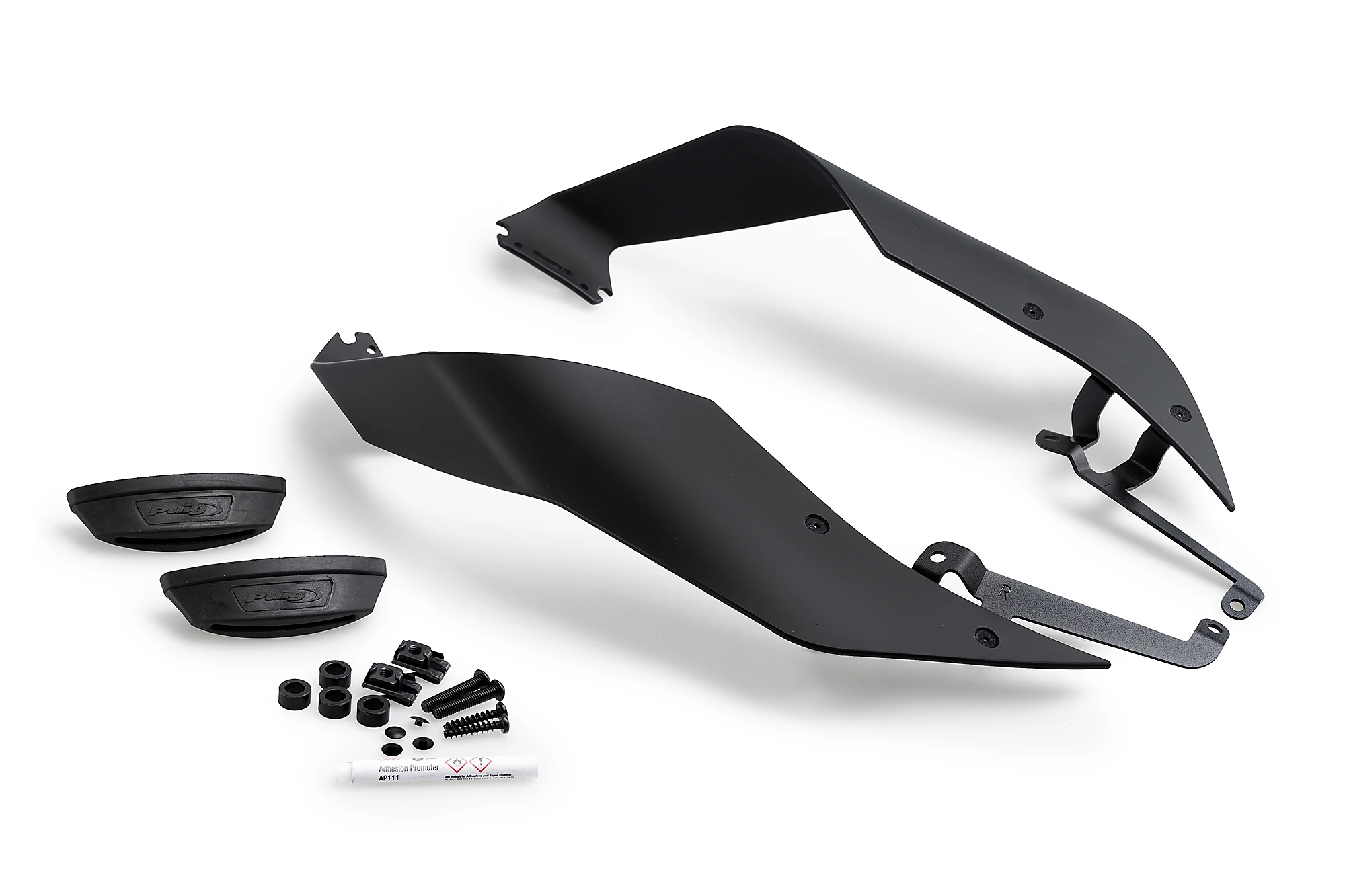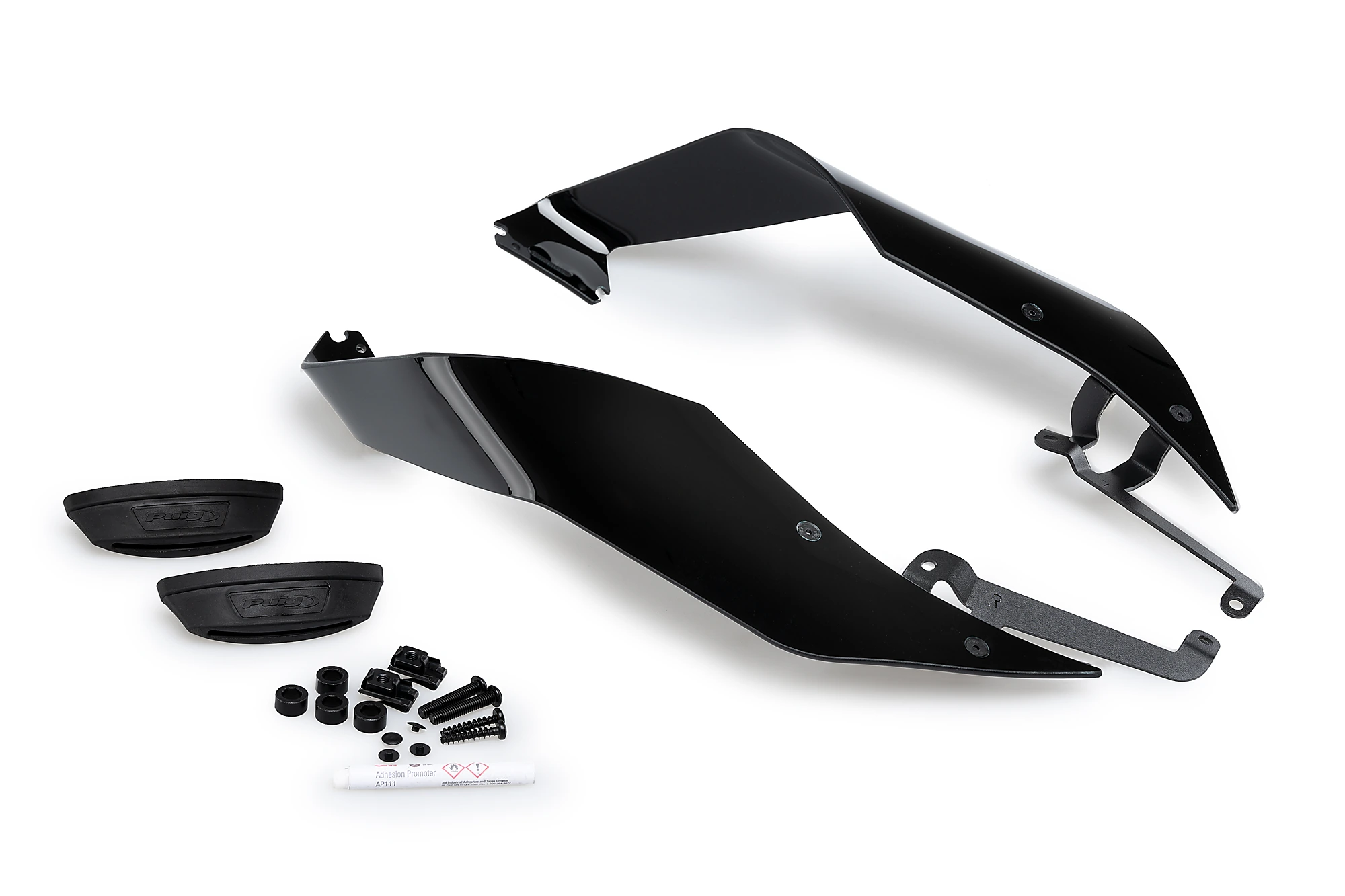 They are made up of two elements: supports injected in flexible plastic that adapt perfectly to the fairing of your motorcycle by means of a 3M dual lock adhesive, strong, resistant and durable, but that can be removed and does not damage or require holes in your fairing. And the second element is a closed-shaped spoiler, which is made of 4mm high-impact acrylic material following safety regulations, with rounded edges with a radius> 2mm, a material of great rigidity and lightness, perfect for receiving aerodynamic pressure and directly translating it into downforce.