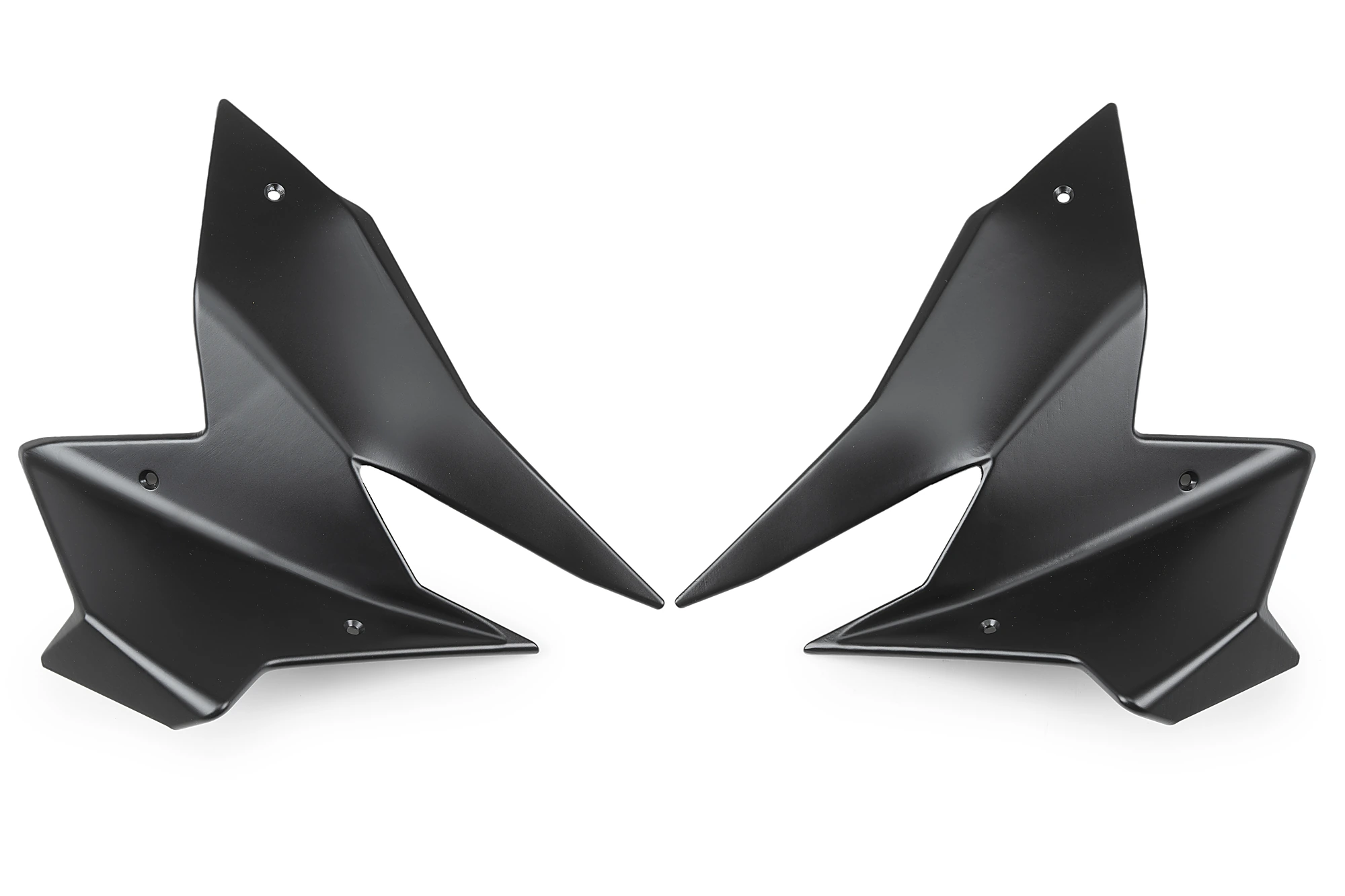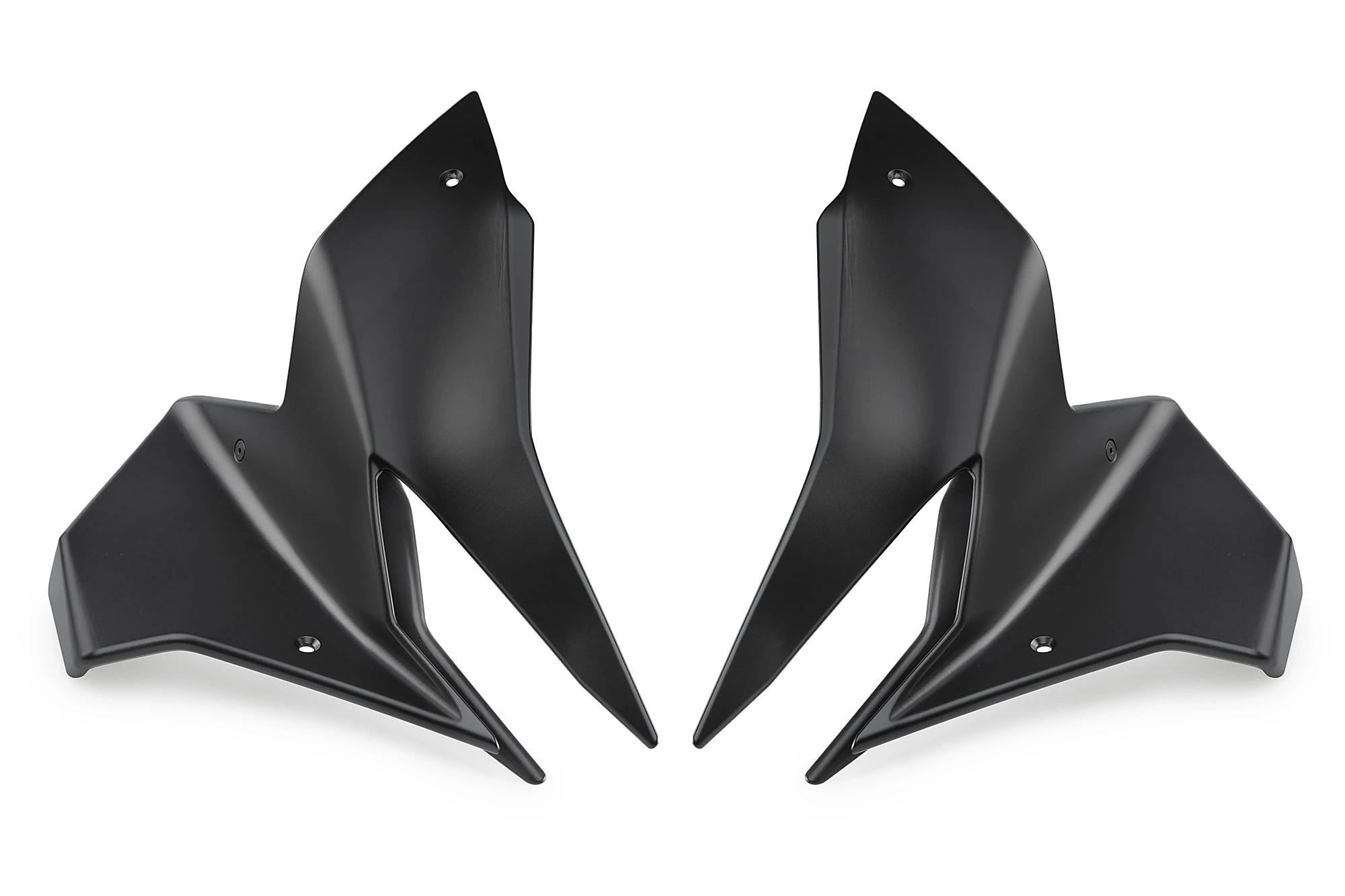 Their design visually enlarges the front of the bike through large inclined surfaces that, in addition to giving it a more imposing presence, generate downforce on the front axle at high speed. This effect occurs because the air flowing over the upper surface of the wing exerts downward pressure, while the lower airflow accelerates, creating low pressure. The result is aerodynamic support of up to 5.4 kg on the front axle, with multiple riding benefits: