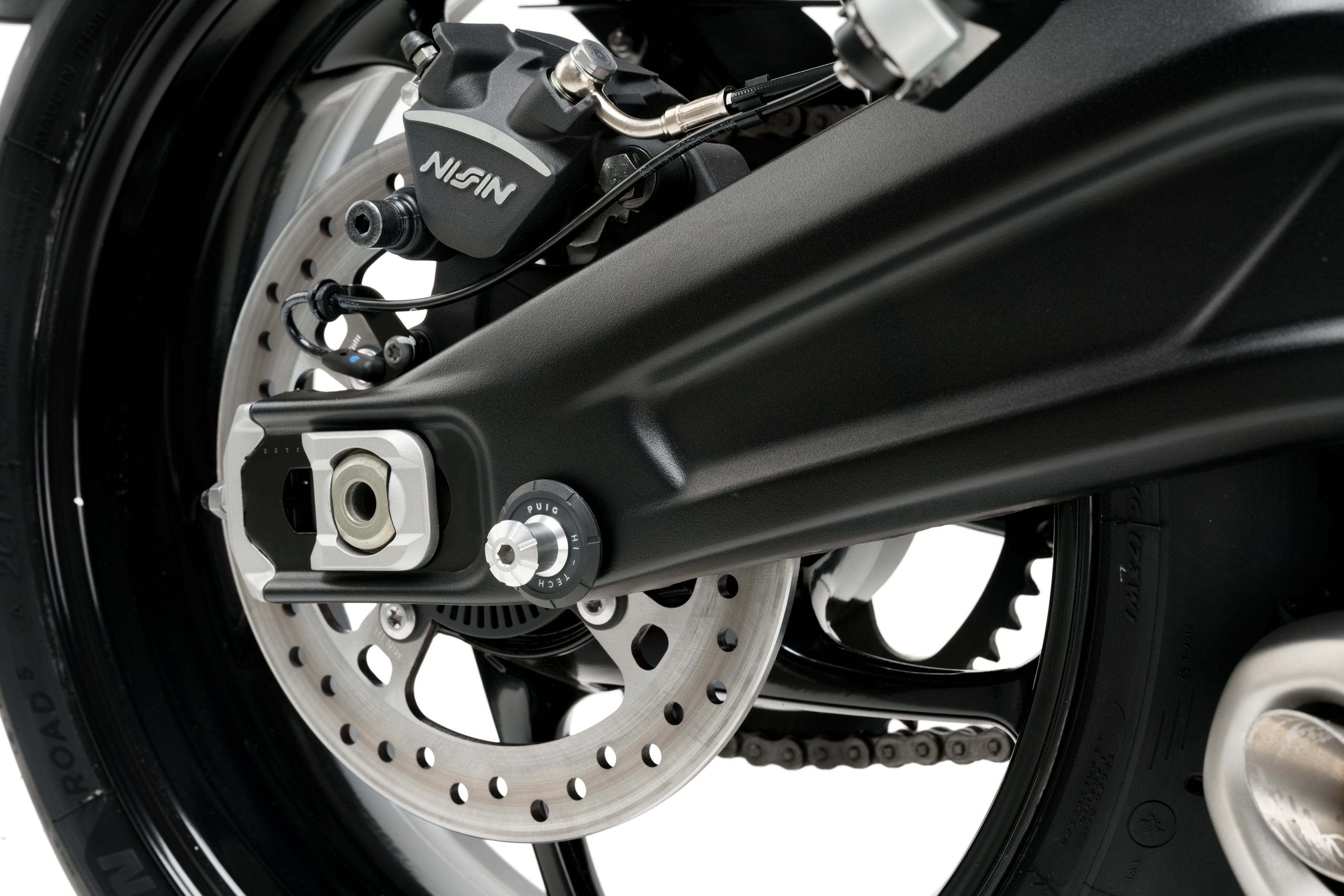 The swingarm is protected by the incorporation of the nylon washer.