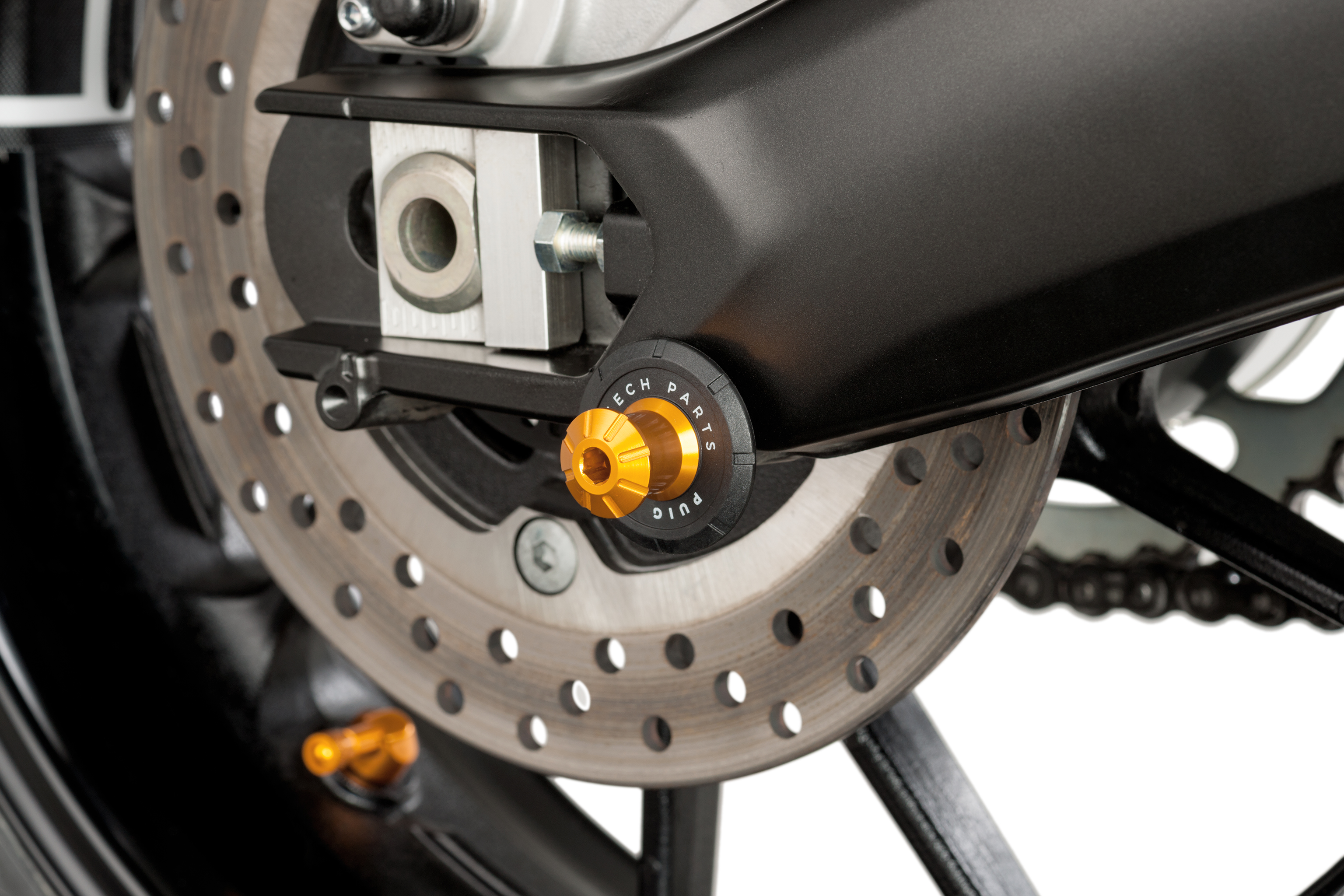 Spools work as a guide to fit a stand and easily raise your motorcycle, quickly and safely. In this case, we present the Spool Pro by Puig. Manufactured from an anodized aluminium billet (reduced weight of 32 gr), it will guarantee the protection of the swingarm from possible scratches thanks to the fact that it comes with a black nylon washer with the Puig Hi-Tech Parts etched on it.