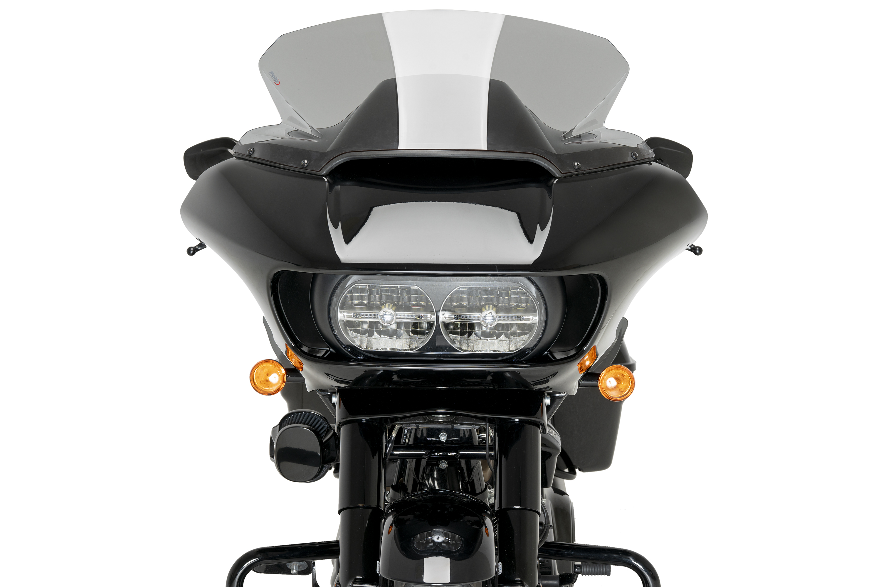 The two versions of the Puig High-Road Windshield replace the original Harley Davidson windshields, being mounted with the same screws, though offering particularities depending on the model. The touring windshield has side shapes designed to better deflect air that would reach the shoulder area to avoid an annoying airflow for the rider.