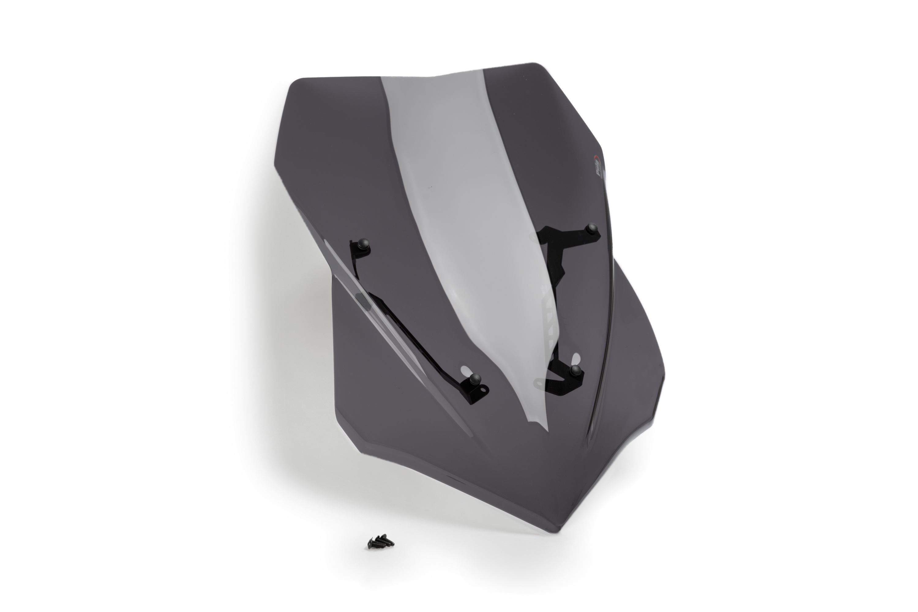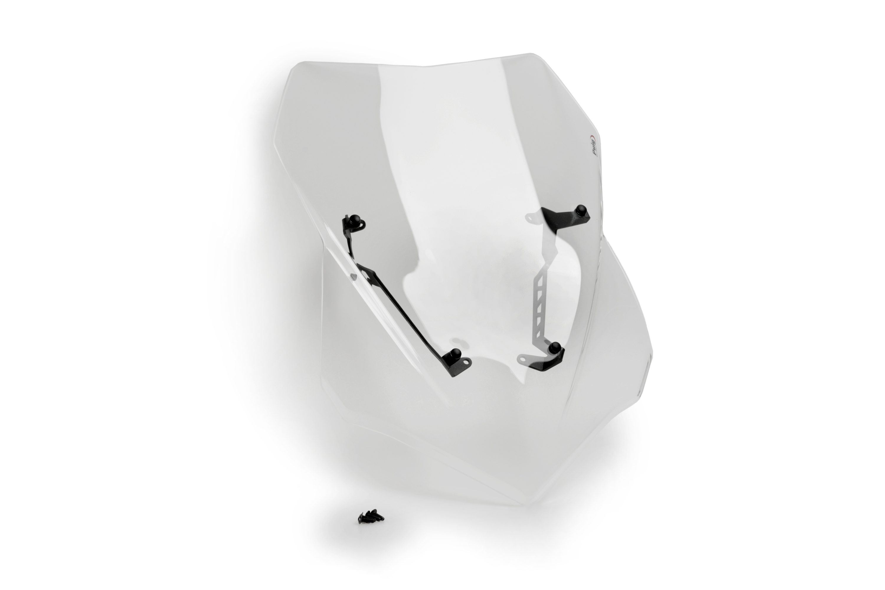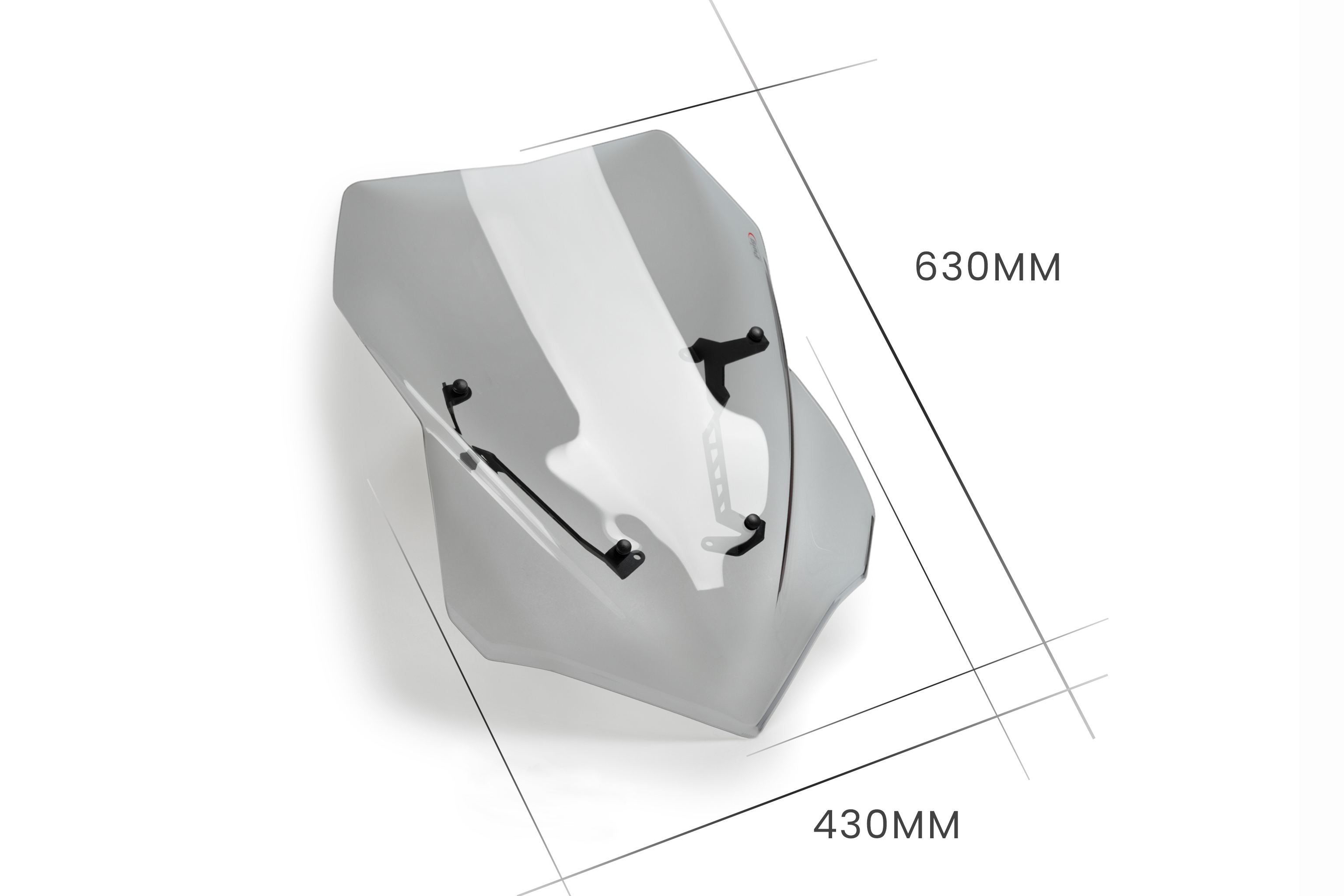 Its V-shape deflects air to the sides of the bike, directing gusts away from the rider and cutting through the wind cleanly, providing the best CX (drag coefficient). The two metal supports that make up the piece separate the screen from the motorcycle, allowing it to grow in width without colliding with the handguards, for greater protection of the area of the hands, forearms and shoulders.
