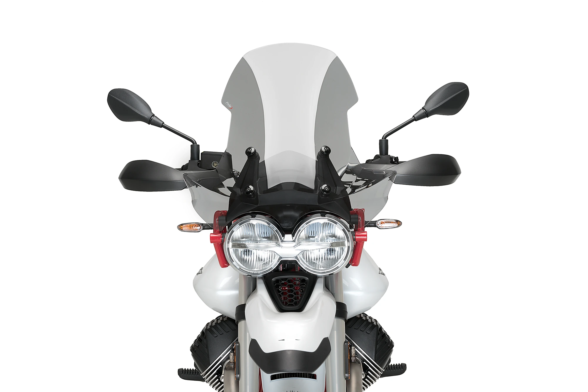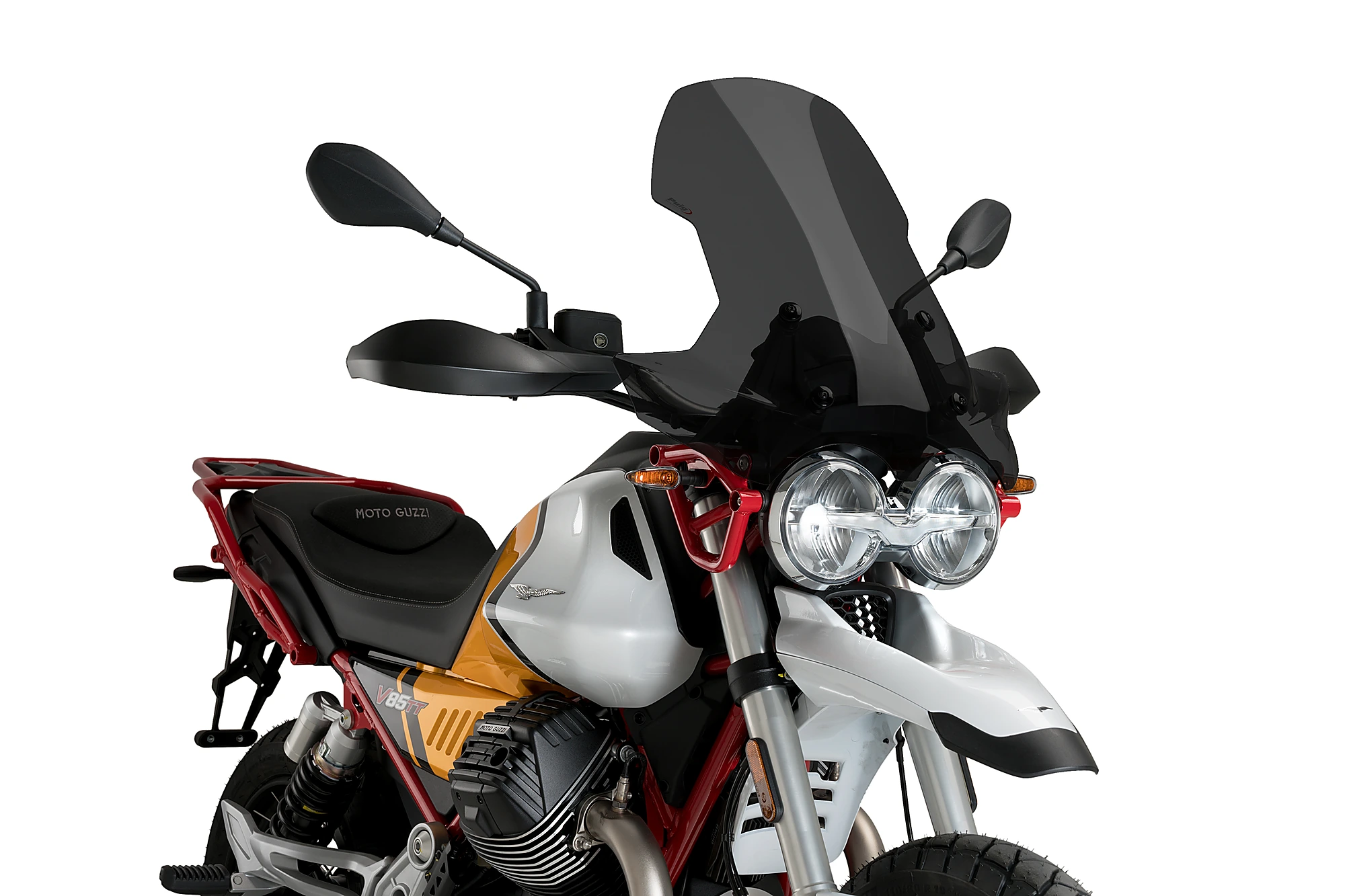 With total measurements of 580 mm high by 560 mm wide, the Puig touring screen is 230 mm higher than the original screen of the Moto Guzzi V85 TT 850 19'-.