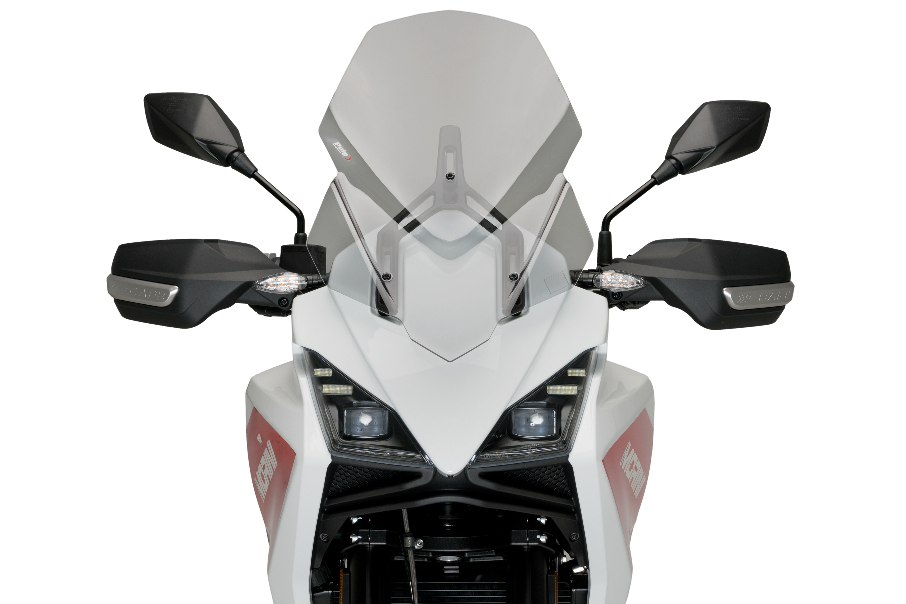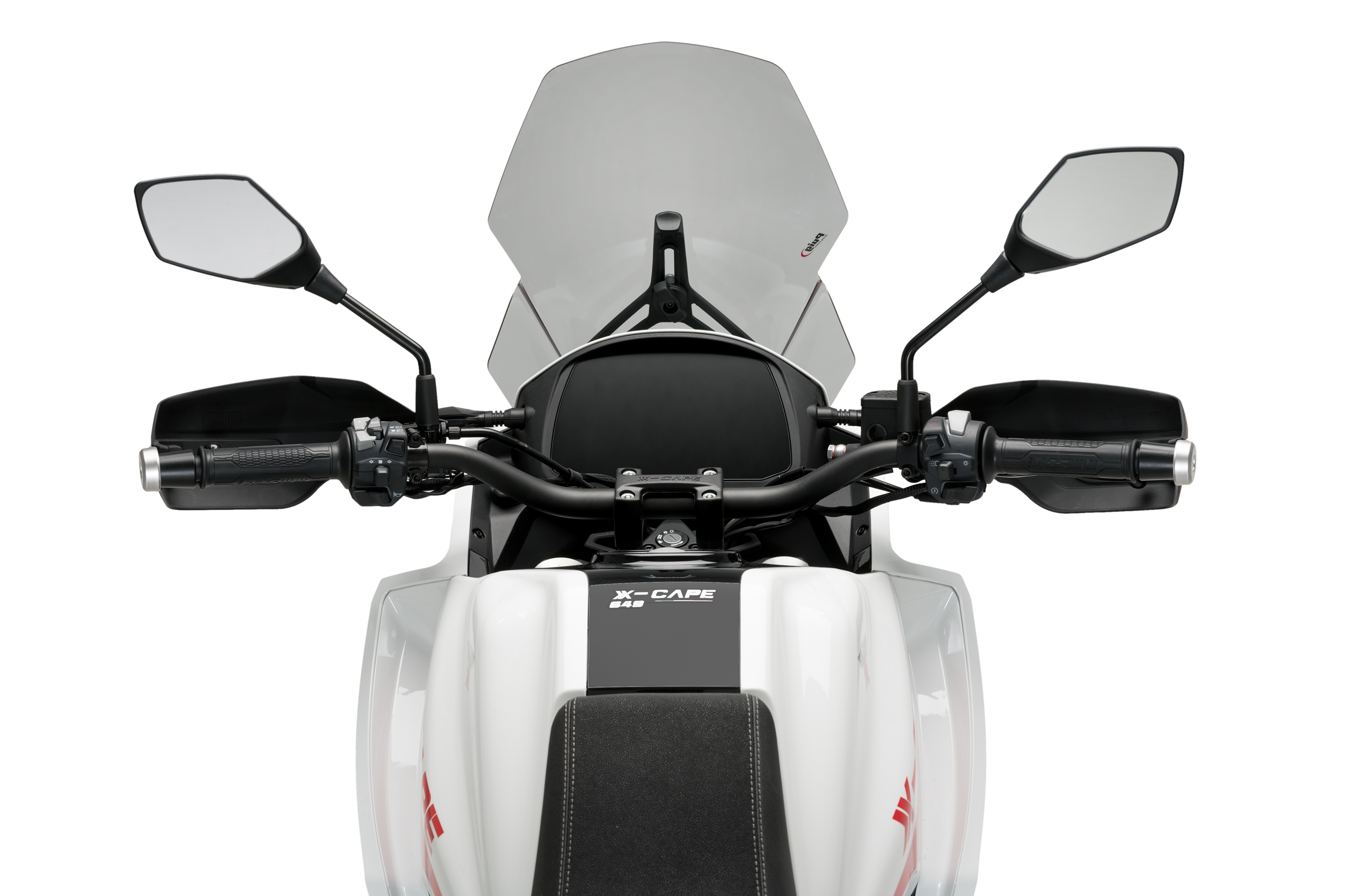 With overall measurements of 365mm wide by 525mm high, the Puig Touring screen is 90mm taller than the original Moto Morini X-Cape screen. It is compatible with the original handguards.