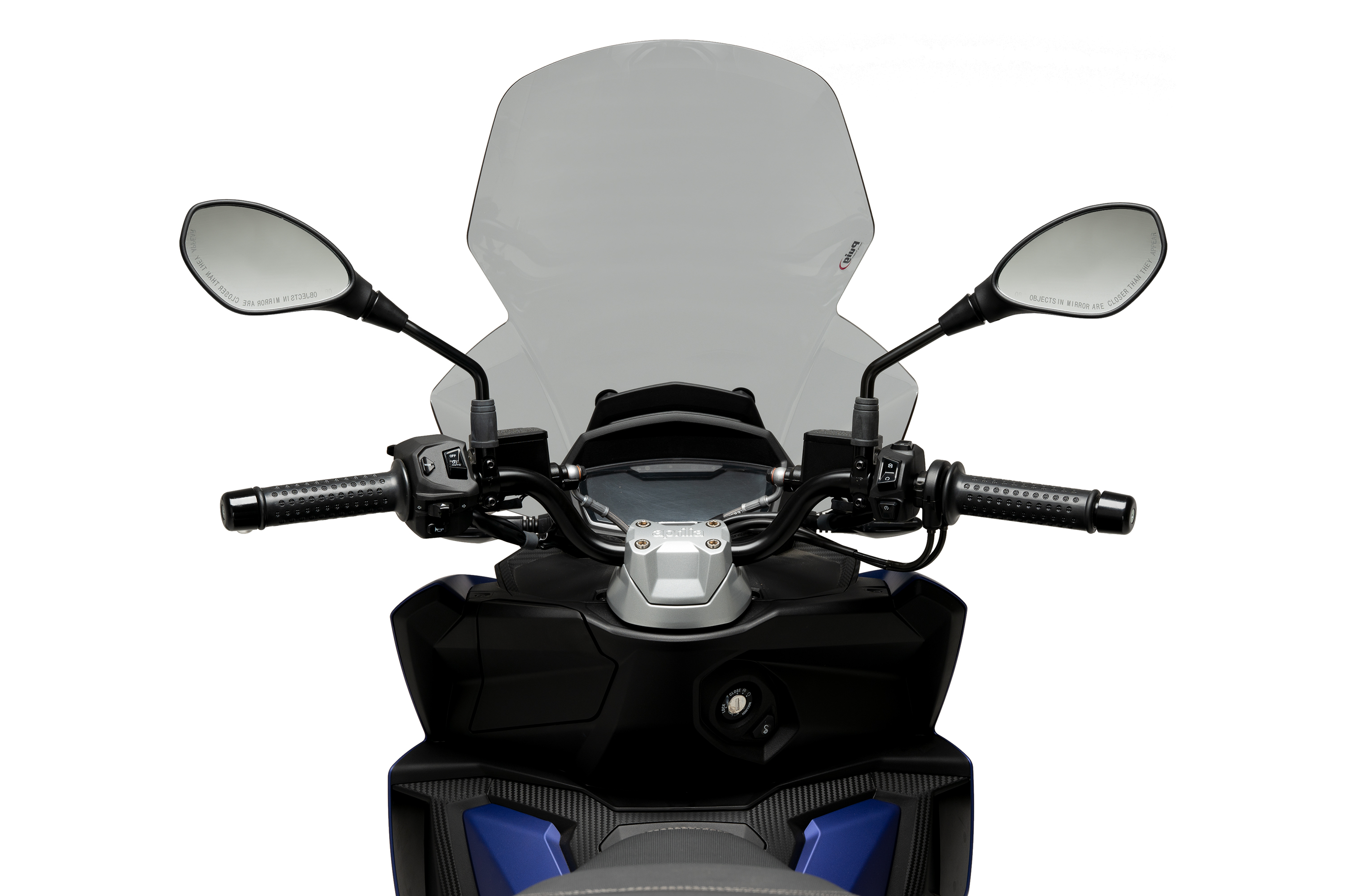 Thanks to its large size and its shapes developed with virtual wind tunnel technology, the Puig V-Tech Touring screen has an angular shape in its central and lateral part that facilitates the channeling of air, redirecting it to the lateral parts and minimizing turbulence. In this way, a large part of the air that impacts against the rider is effectively diverted, so that the rider supports less air pressure compared to the original screen, improving riding comfort and reducing fatigue.