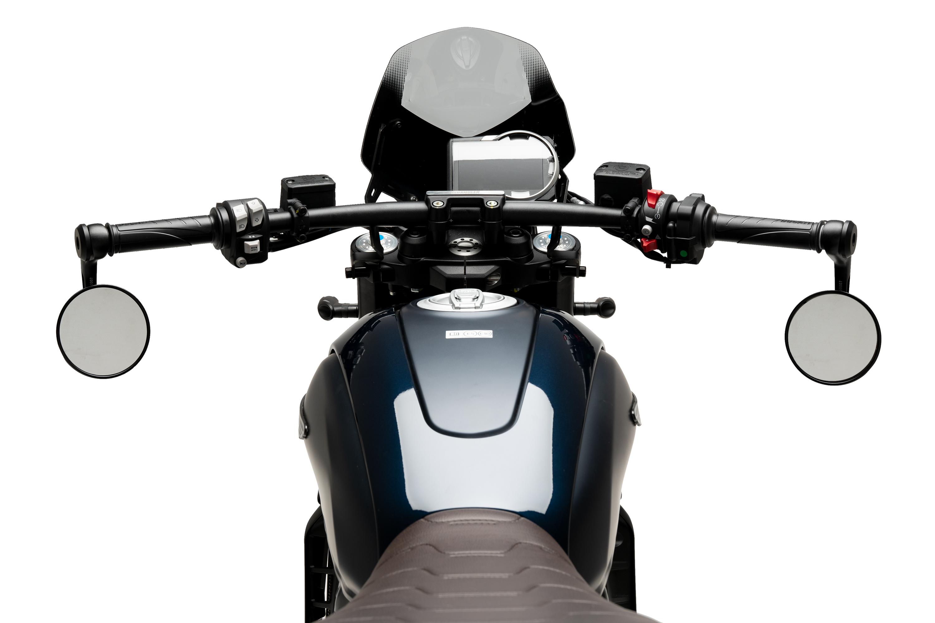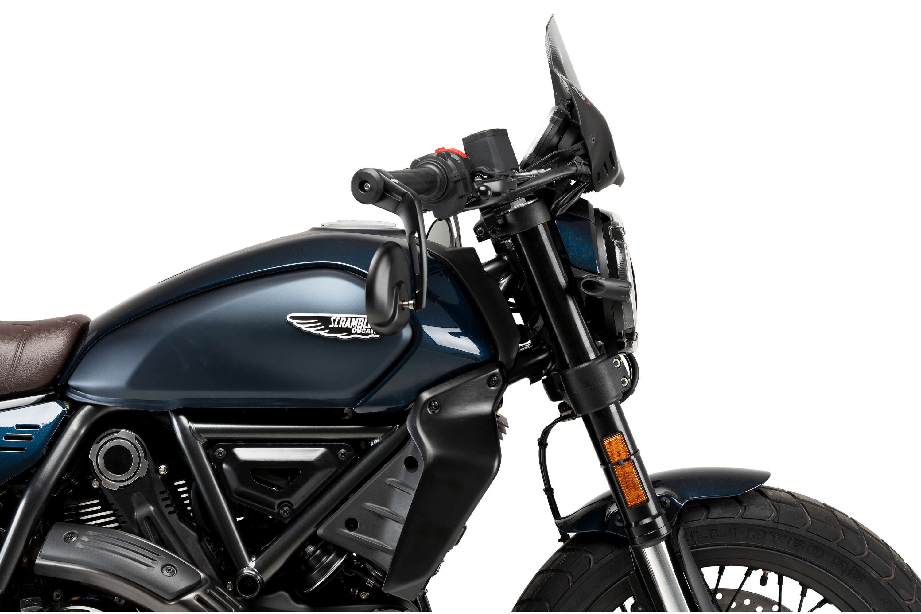 Designed specifically for the Ducati Scrambler 23', the naked NG Sport screen is characterized by its asymmetry, with a surface on the right side to avoid contact with the Scrambler's clock, which is also asymmetrical. While in the left area the surfaces are much closer to the handlebars to achieve more protection.