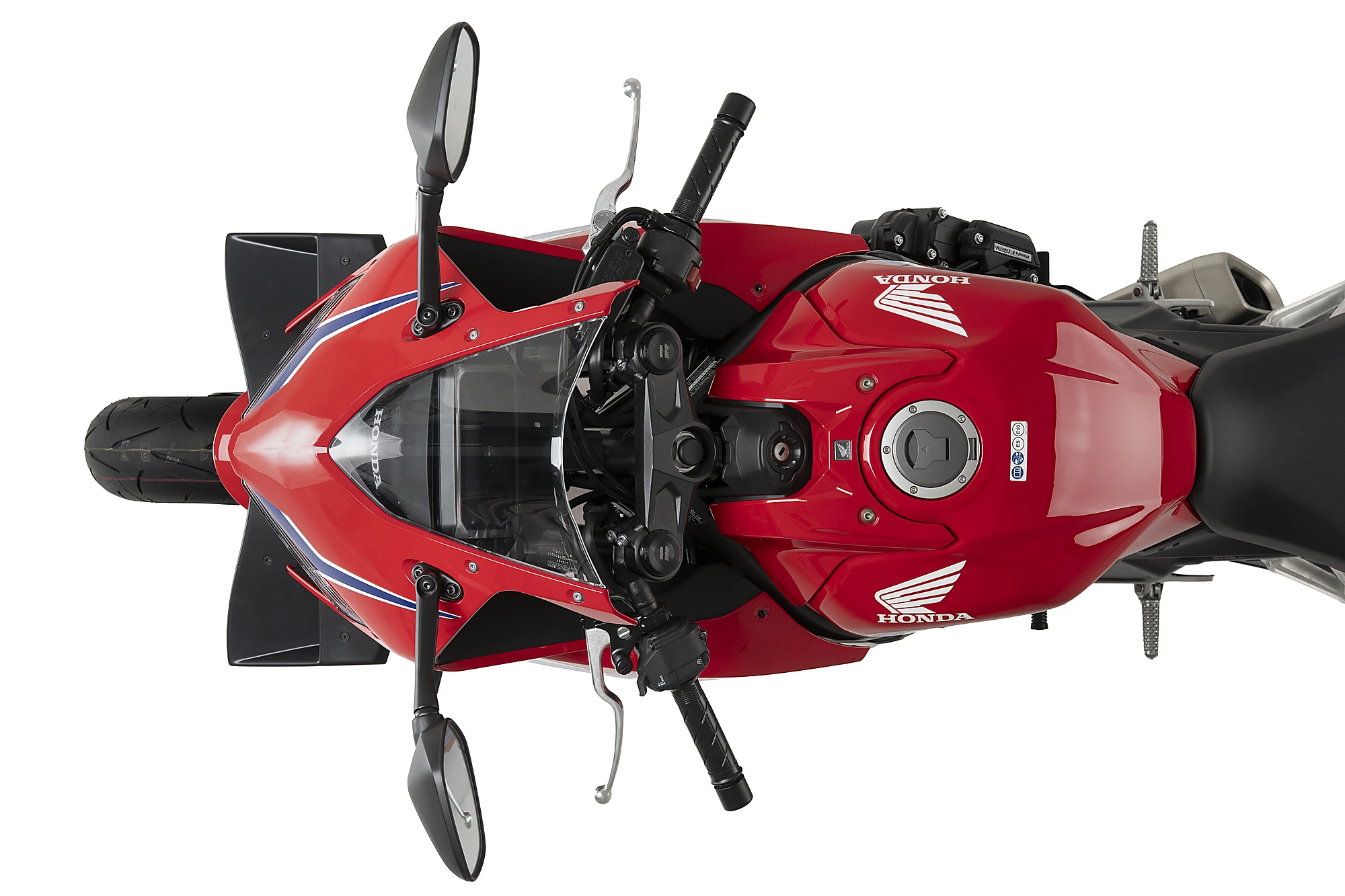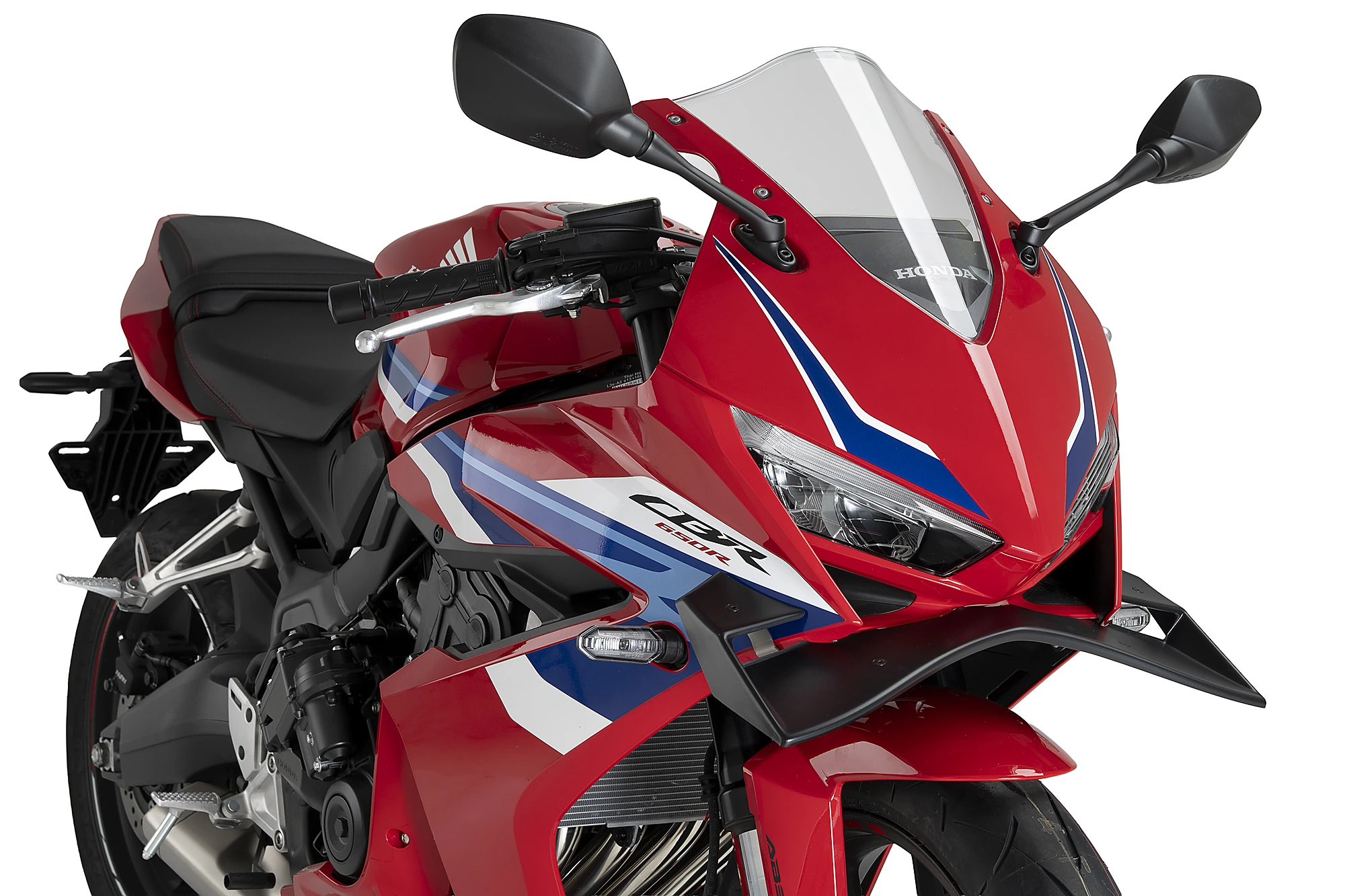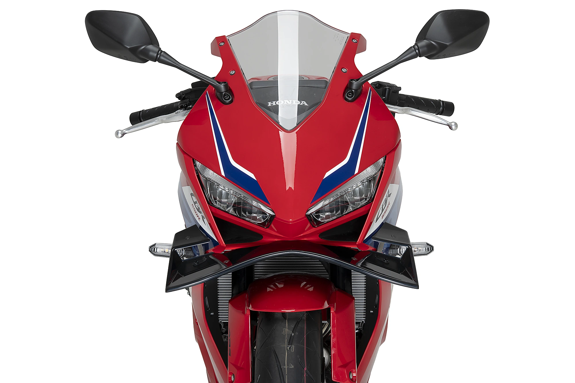 Las amplias superficies que lo conforman aportan una mayor presencia frontal a la CBR650R, ampliando visualmente la anchura de la motocicleta y reforzando su carácter deportivo al mismo tiempo que realzan las líneas de diseño originales del modelo.