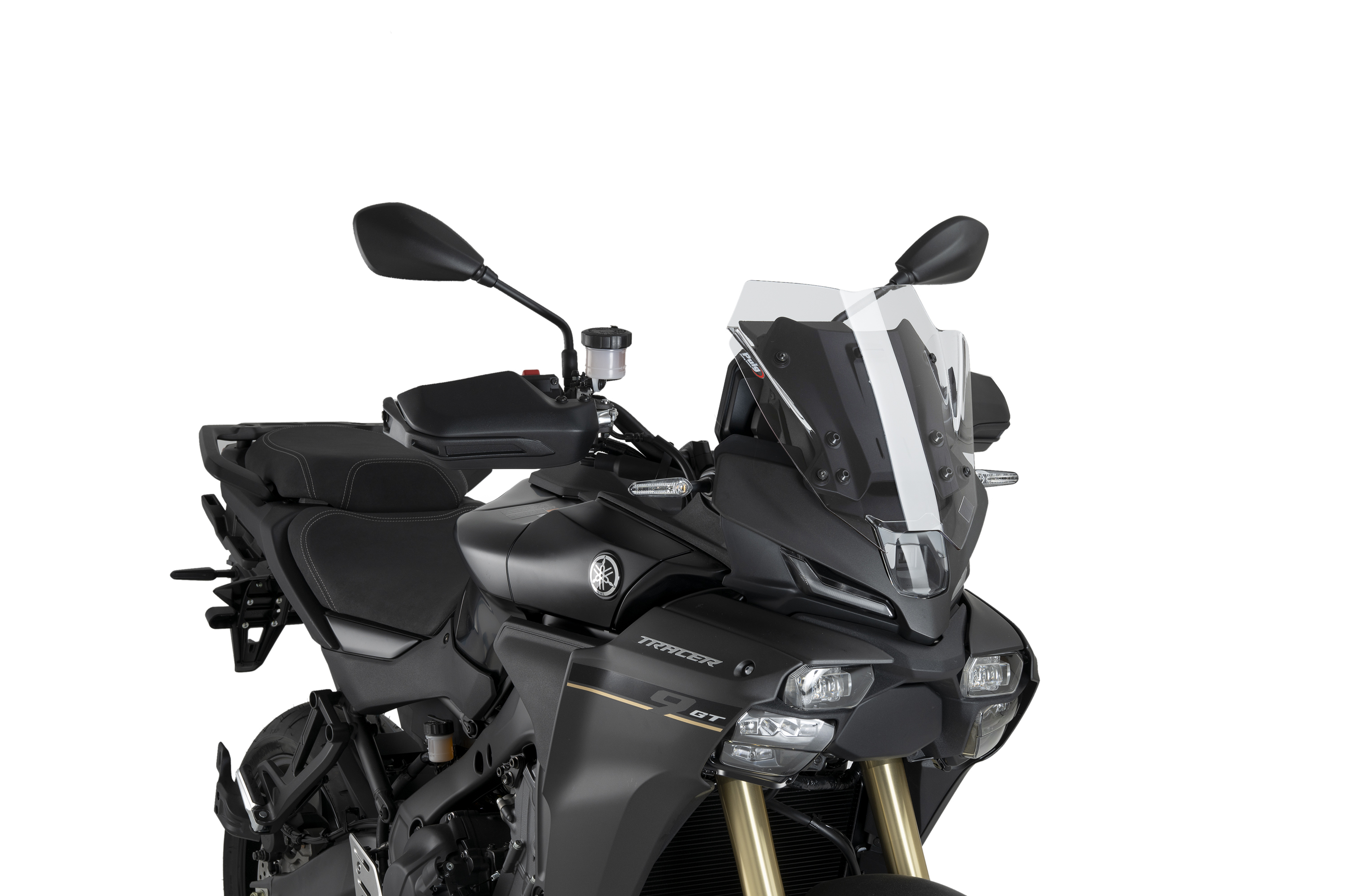 Su diseño compacto y refinado permite mantener un amplio campo de visión por encima de la pantalla, lo que se traduce en una mayor sensación de libertad, movilidad sobre la moto y confort durante la conducción. Gracias a la regulación automática de altura que viene de serie en la Tracer 900 GT, es posible ajustar la cúpula en la posición más elevada para optimizar la protección aerodinámica incluso con la pantalla Sport montada.