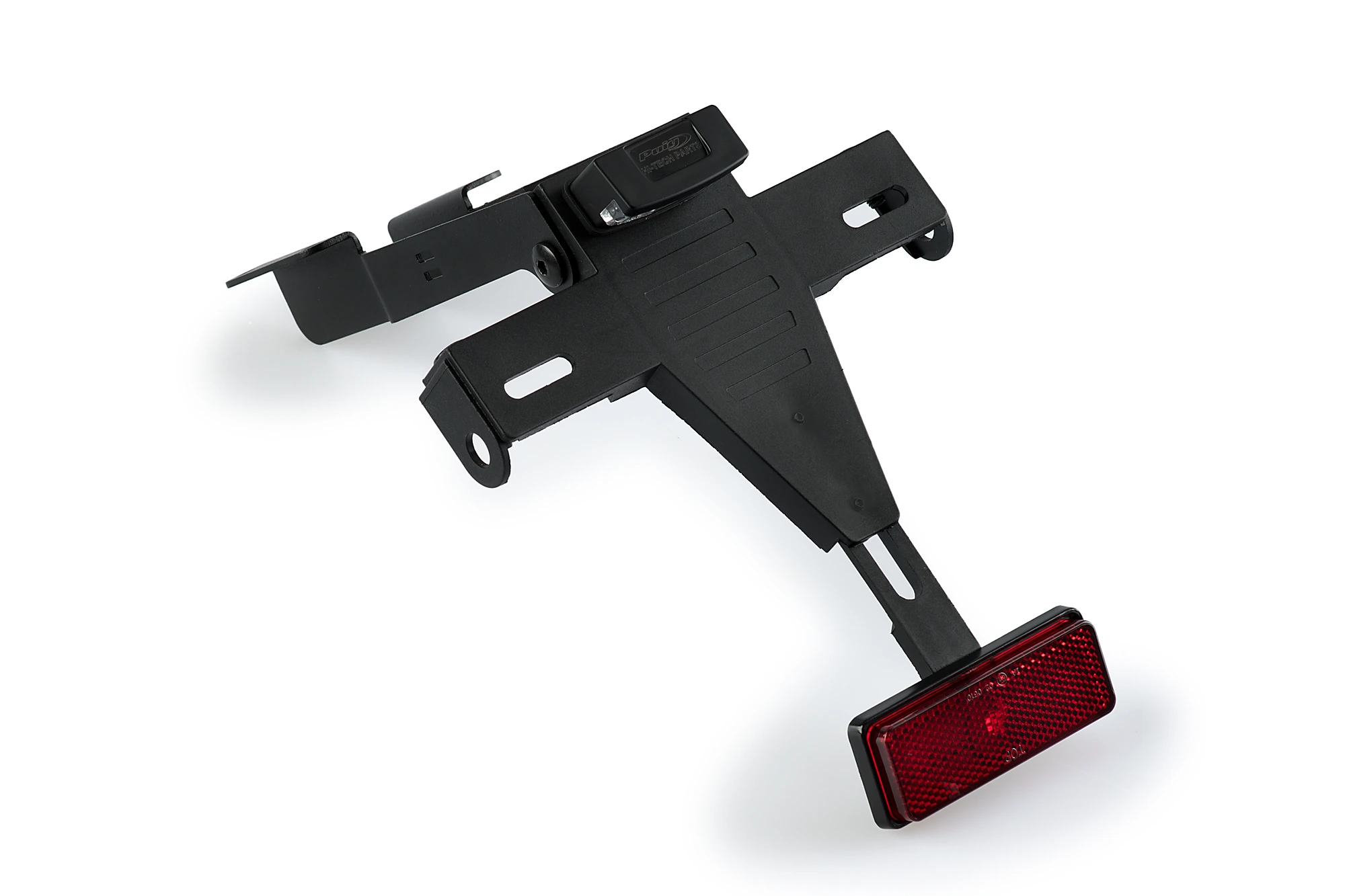 Sustituye el portamatrículas original de tu moto por el soporte portamatrículas de Puig, que, gracias a su ubicación elevada, proporciona un aspecto deportivo a tu motocicleta. El conjunto combina piezas de acero con acabado en pintura epoxi y elementos de poliamida, logrando una notable reducción de peso en comparación con el soporte original.