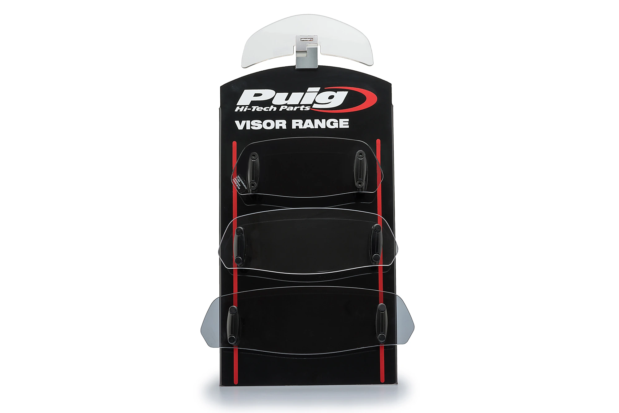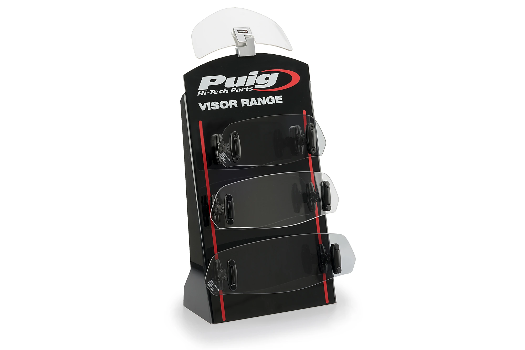 Montrez les différents types de visière Puig Hi-Tech Parts disponibles dans le catalogue avec un seul présentoir, vous n'aurez besoin de rien d'autre. Les deux niveaux inférieurs sont réservées aux déflecteurs qui nécessitent une fixation avec une perceuse, tandis que le premier support peut accueillir un exemple de visière clip on. Chez Puig, nous vous encourageons à tirer le meilleur parti de cette pièce, en plaçant la visière sur la partie supérieure de votre pare-brise. De cette manière, vos clients pourront facilement voir et vérifier son mécanisme, ainsi que choisir entre les différentes tailles disponibles.