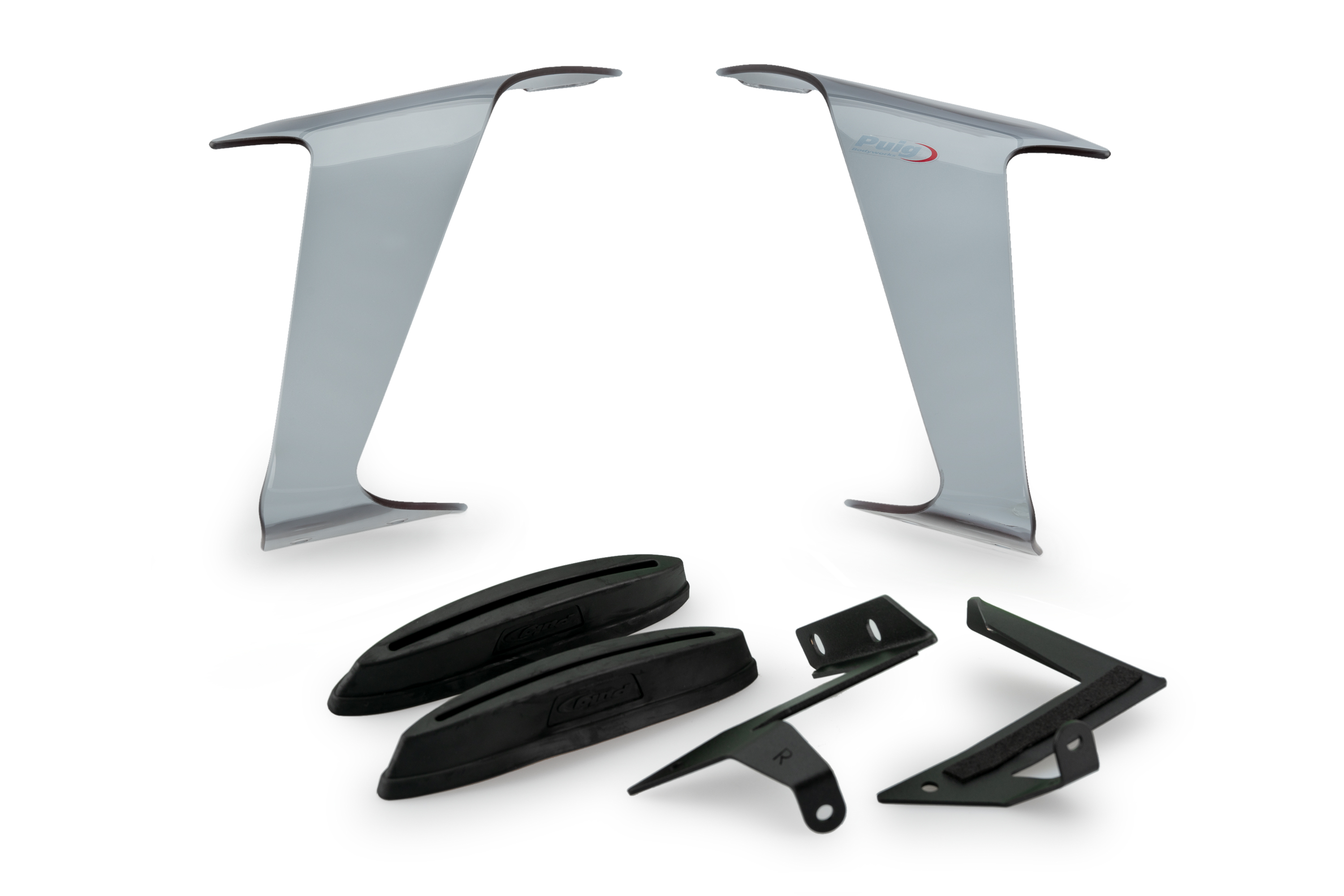 Grâce aux tests aérodynamiques virtuels et à l'expérience en Moto GP, la technologie aérodynamique des ailerons s'ajoute à l'effet "anti-guidonnage" dans les fortes accélérations, jouant avec la canalisation de l'air et la pression qu'il exerce vers le sol. Son design est spécifiquement conçu pour produire ces effets, mais aussi dans l'esthétique de votre moto de sport. Dans cet objectif, ils seront disponibles en noir brillant, rouge transparent et fumé foncé afin que vous puissiez adapter celui qui convient le mieux à votre style.