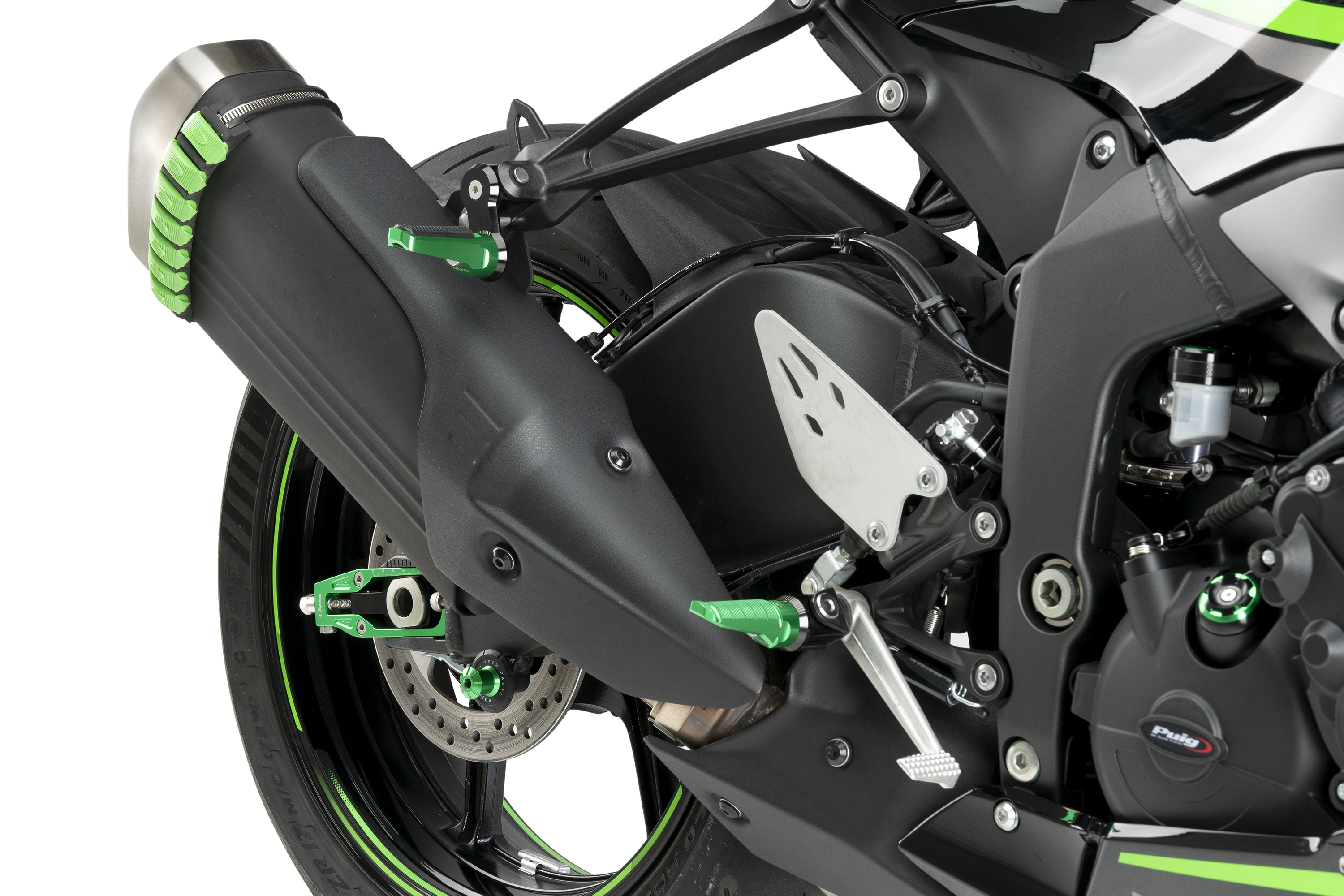 Les repose-pieds racing  Puig sont spécialement conçus pour les motos R et offrent une adhérence maximale au conducteur et au passager. Sa conception sportive attrayante en fait le complément idéal pour les motos les plus radicales, dont l'esthétique reçoit une touche encore plus extrême. Ils mesurent 72 mm de long et 27 mm de large et leur poids est seulement de 90 gr. L'ergonomie est un facteur clé dans sa conception, il a été dessiné  pour augmenter la hauteur  au sol, ce qui augmente l'angle de la moto. Ils sont réglables en inclinaison et ont des marques qui assurent une plus grande précision dans son assemblage. Les