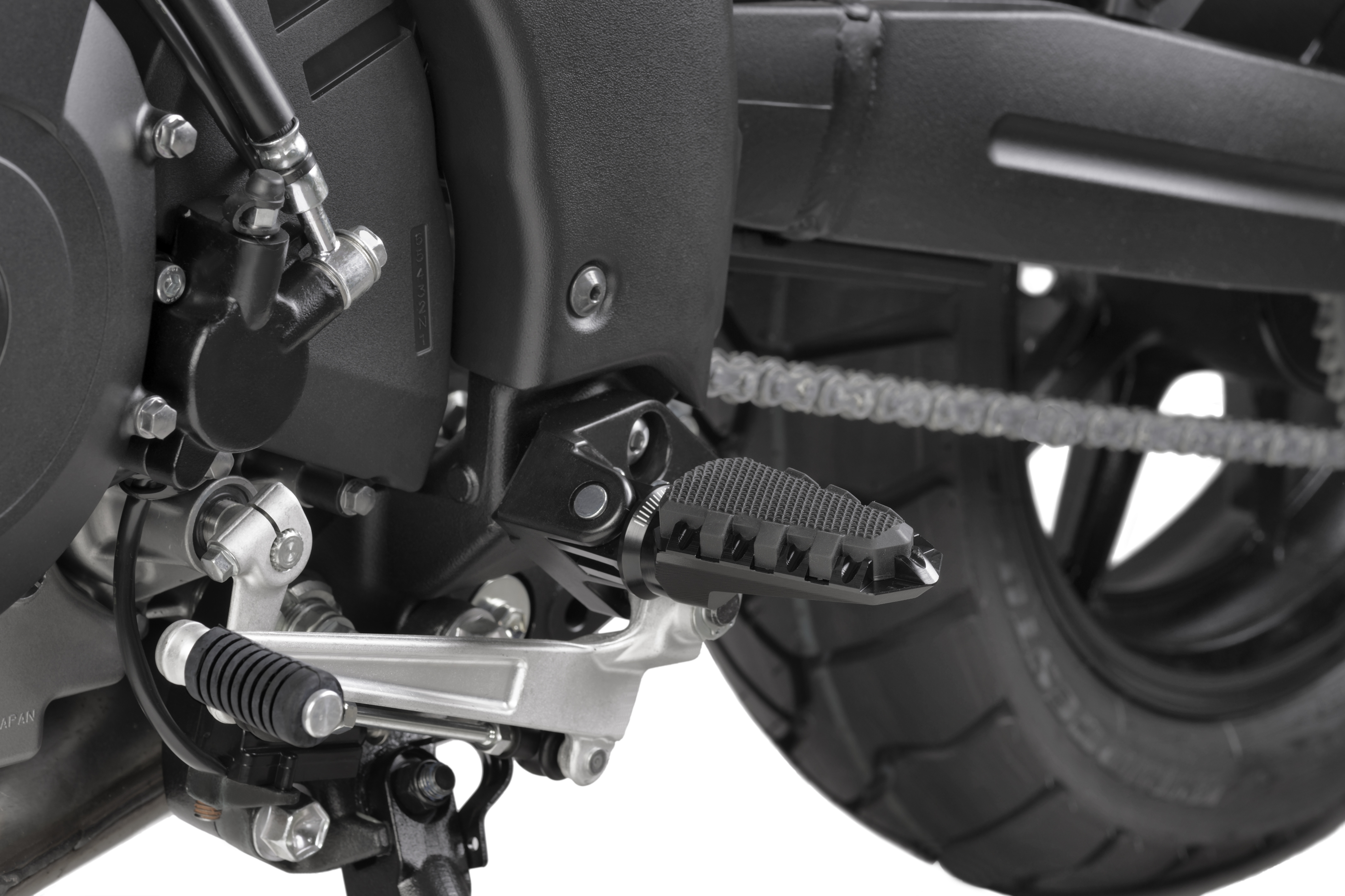 Ils sont réglables en inclinaison et des marques ont été gravées sur le corps pour assurer un montage plus précis. Les repose-pieds TRAIL  procurent au conducteur une plus grande confiance en lui lorsqu'il roule avec sa moto, à la fois sur des tronçons sinueux où plus de précision et de tact sont nécessaires, ainsi que sur de longs trajets sur des routes dégagées
