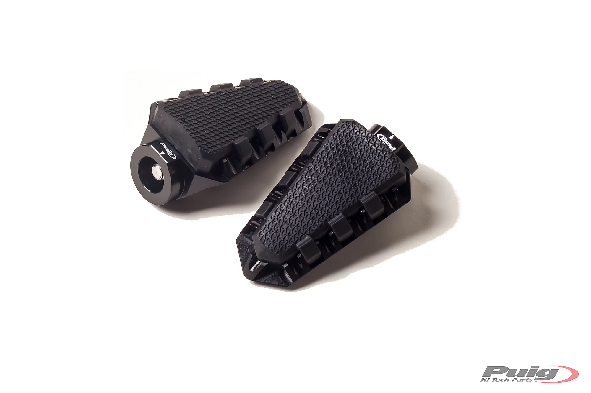 Les repose-pieds TRAIL de Puig sont spécialement conçus pour les motos de type Tourer et offrent au conducteur une adhérence et un confort maximum en toutes circonstances, grâce au caoutchouc installé dans la zone de contact de la chaussure. Ces repose-pieds sont en aluminium anodisé et se distinguent par leur design moderne et sportif, conçus pour devenir le complément idéal des motos les plus polyvalentes. Ils mesurent 85 mm de long et 51 mm de large et ne pèsent que 130 grammes. L'ergonomie a été l'un des facteurs les plus pris en compte dans leur développement, ce qui a permis d'augmenter leur hauteur libre au sol et, par conséquent, laz moto a un plus grand angle d'inclinaison.