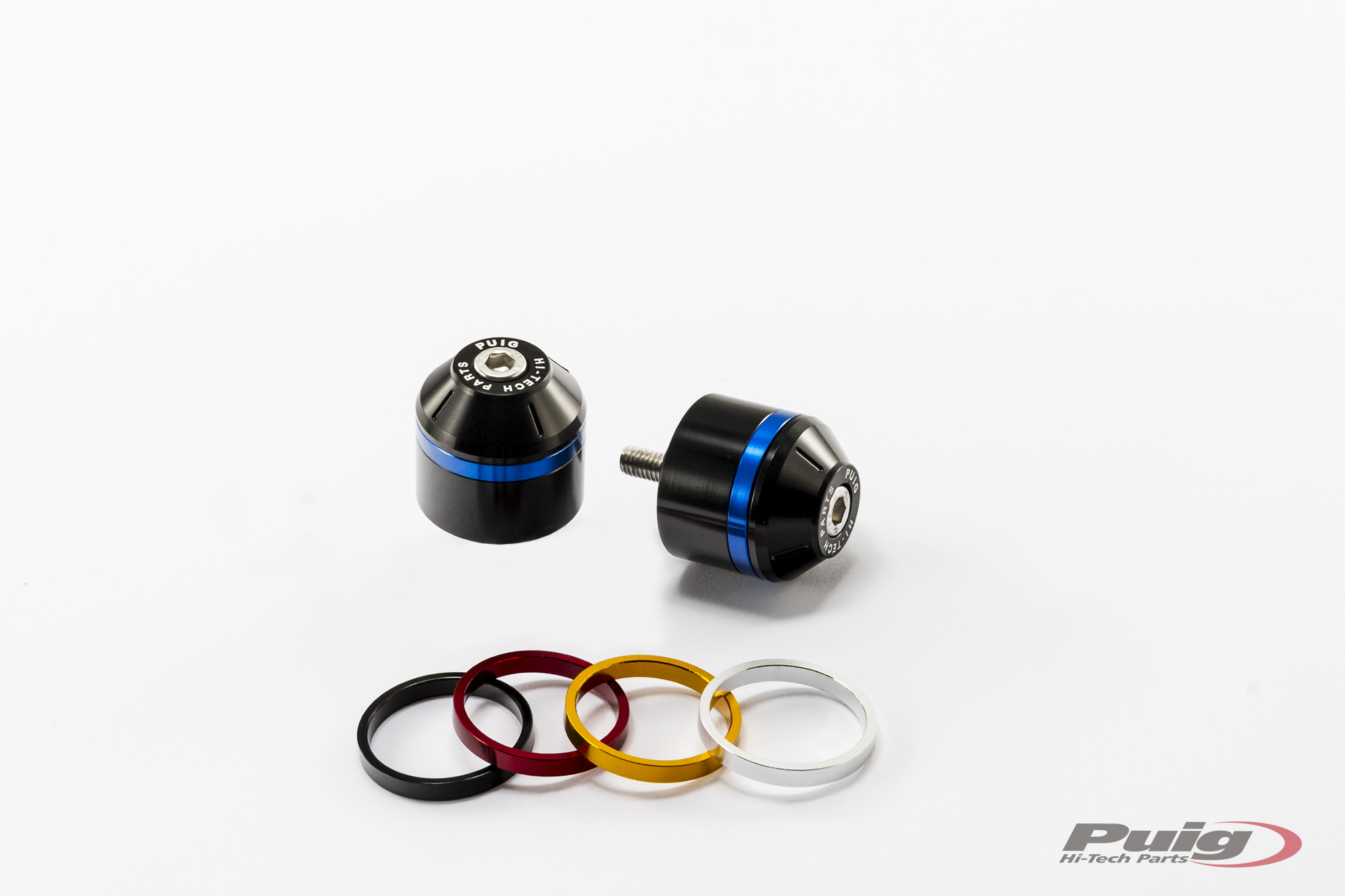 Pièce usinée à partir d’un bloc d’aluminium (pesant seulement 58 g et mesurant 30 mm), elle présente la particularité d’avoir un anneau encastré dans les extrémités qui donnera une touche de couleur à l’embout de finitioni noire. En ce qui concerne les anneaux, Puig propose un kit de 10 bagues (2 par couleur) pour personnaliser la moto à votre goût .Les Couleurs proposées sont: noir, bleu, rouge, argent et or. Si vous voulez la couleur verte, elle n’est livrée que pour les références.8498N / 8074N / 9359N (Kawasaki et universel). Il est à noter que les embouts de guidon sont servis par paire. Dans la section des pièces de rechange, Puig propose également la possibilité de commander  les anneaux séparément.