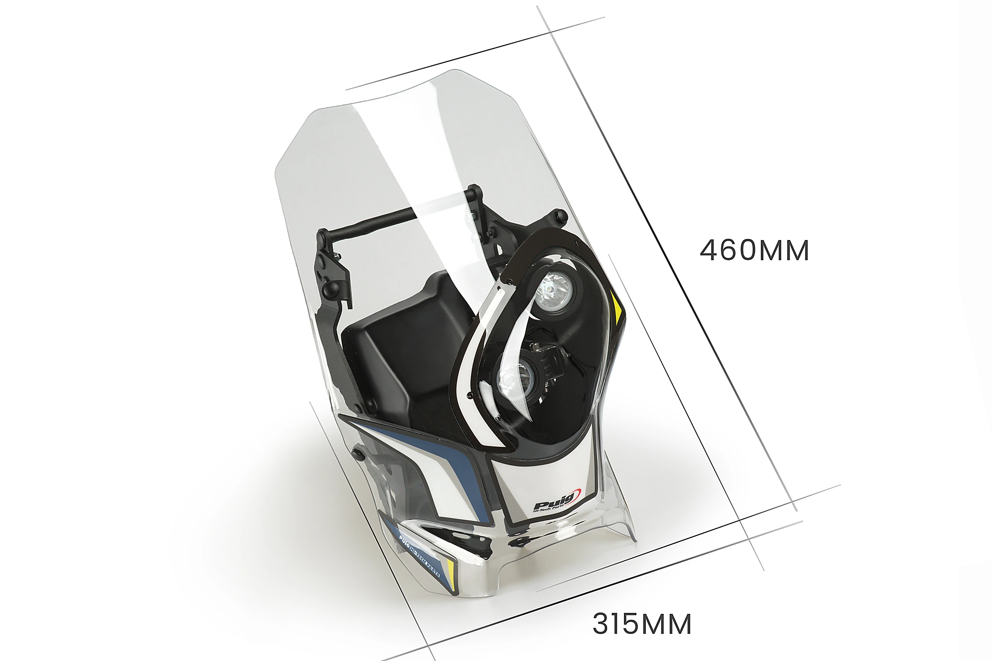 Fabriqué en polycarbonate transparent, incassable et haute performance, le nouveau semi-carénage dévie la pression de l'air, améliorant la protection et le confort du cycliste pendant le parcours. Grâce à sa conception, il est possible d'adapter des accessoires de navigation, en étant protégé par celui-ci. De plus, il se compose de 2 coques en plastique ABS qui servent de protection-embellissement du câblage d'origine de la moto et des phares. Les supports sont tous en aluminium de haute qualité qui offrent légèreté, robustesse et en même temps empêchent l'oxydation.