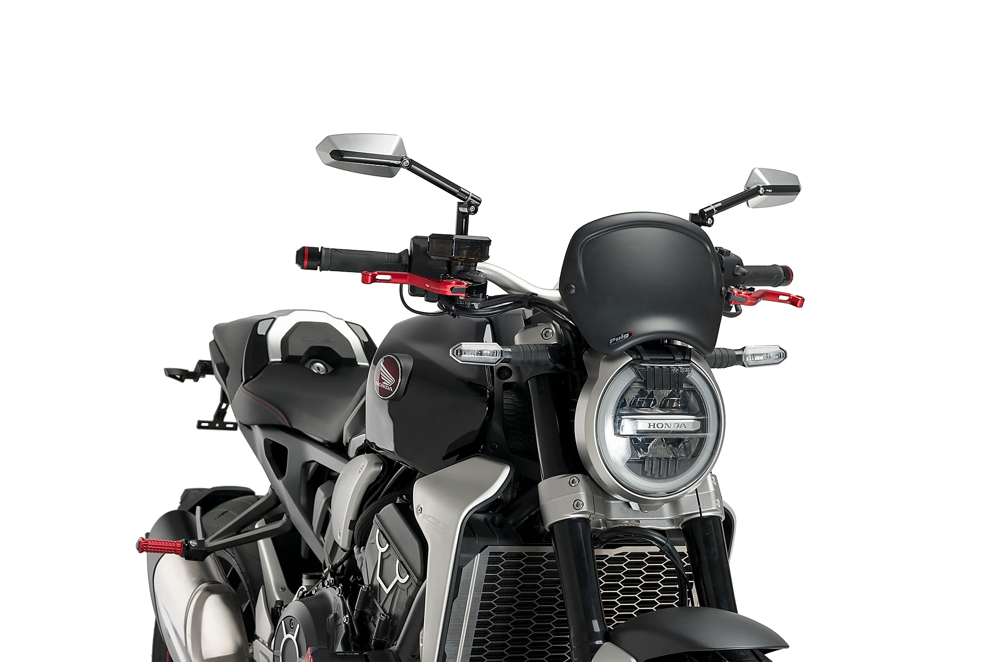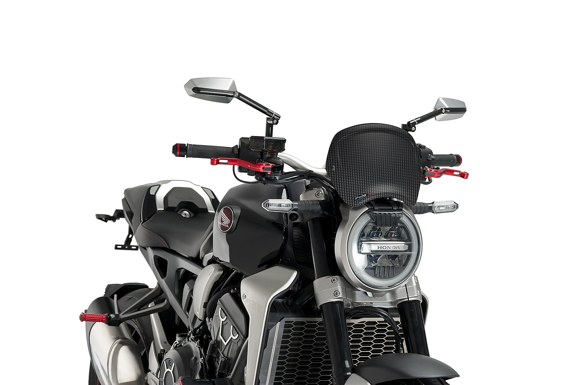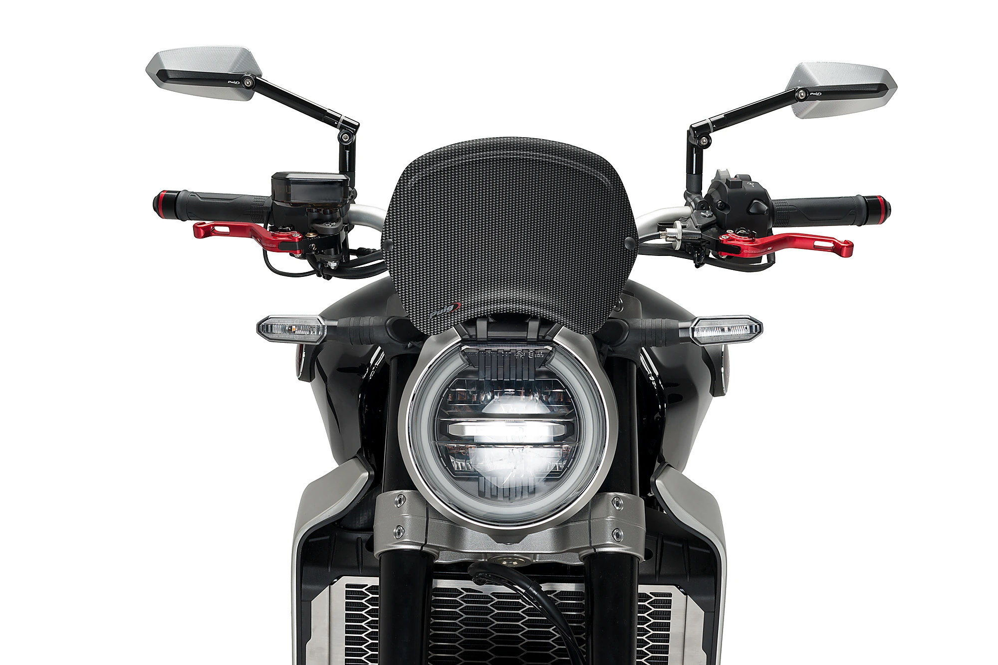 La plaque frontale est disponible en deux finitions, noir mat et carbone, et dans deux formes différentes, symétrique et asymétrique. Elle est homologuée sous le certificat allemand ABE 38007.