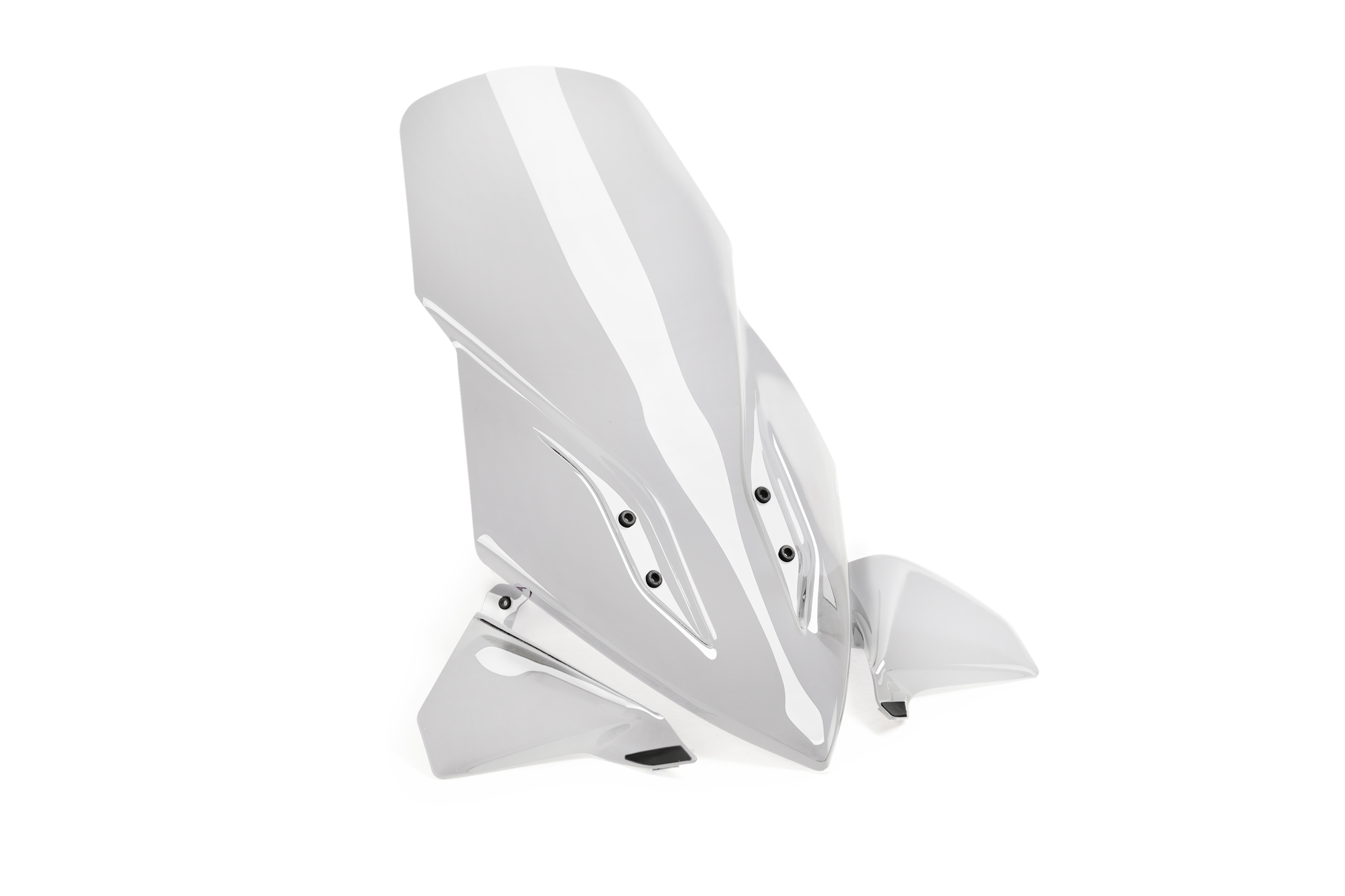 Le pare-brise fait 155 mm plus haut que l'original et augmente la largeur de 165 mm grâce à ses déflecteurs amovibles qui se fixent à la moto pour protéger vos mains et vos bras à tout moment, même si vous changez la position du pare-brise avec le mécanisme de réglage en hauteur intégré.Fabriqué en méthacrylate CN haut de gamme de 4 mm d'épaisseur, avec les meilleures technologies pour réaliser une pièce résistante et légère, avec des bords arrondis de 2 mm pour maximiser la sécurité.