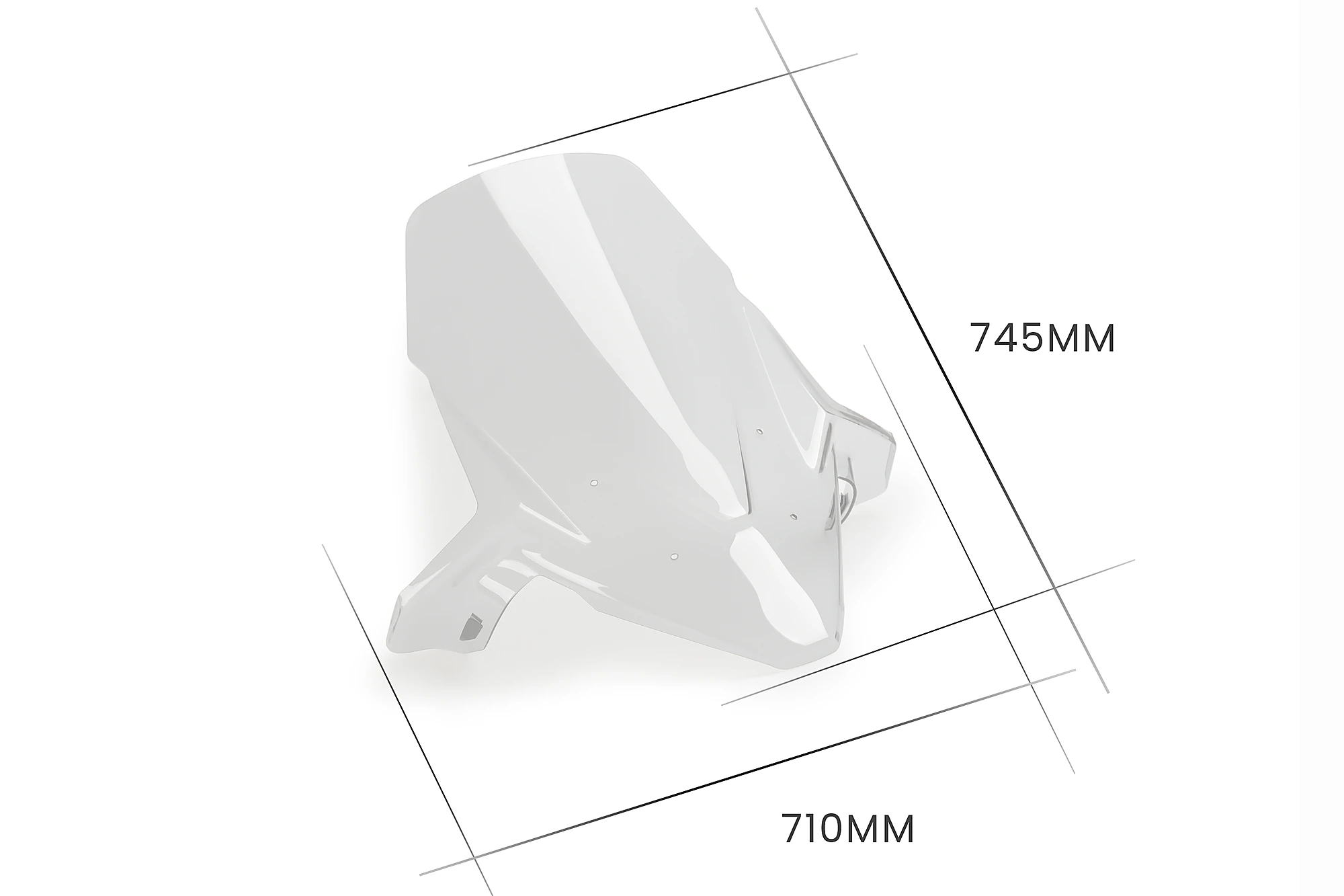 Les mesures de la pièce sont de 710 mm de large sur 745 mm de haut et elle est disponible en finitions transparente, fumée et fumée foncée.