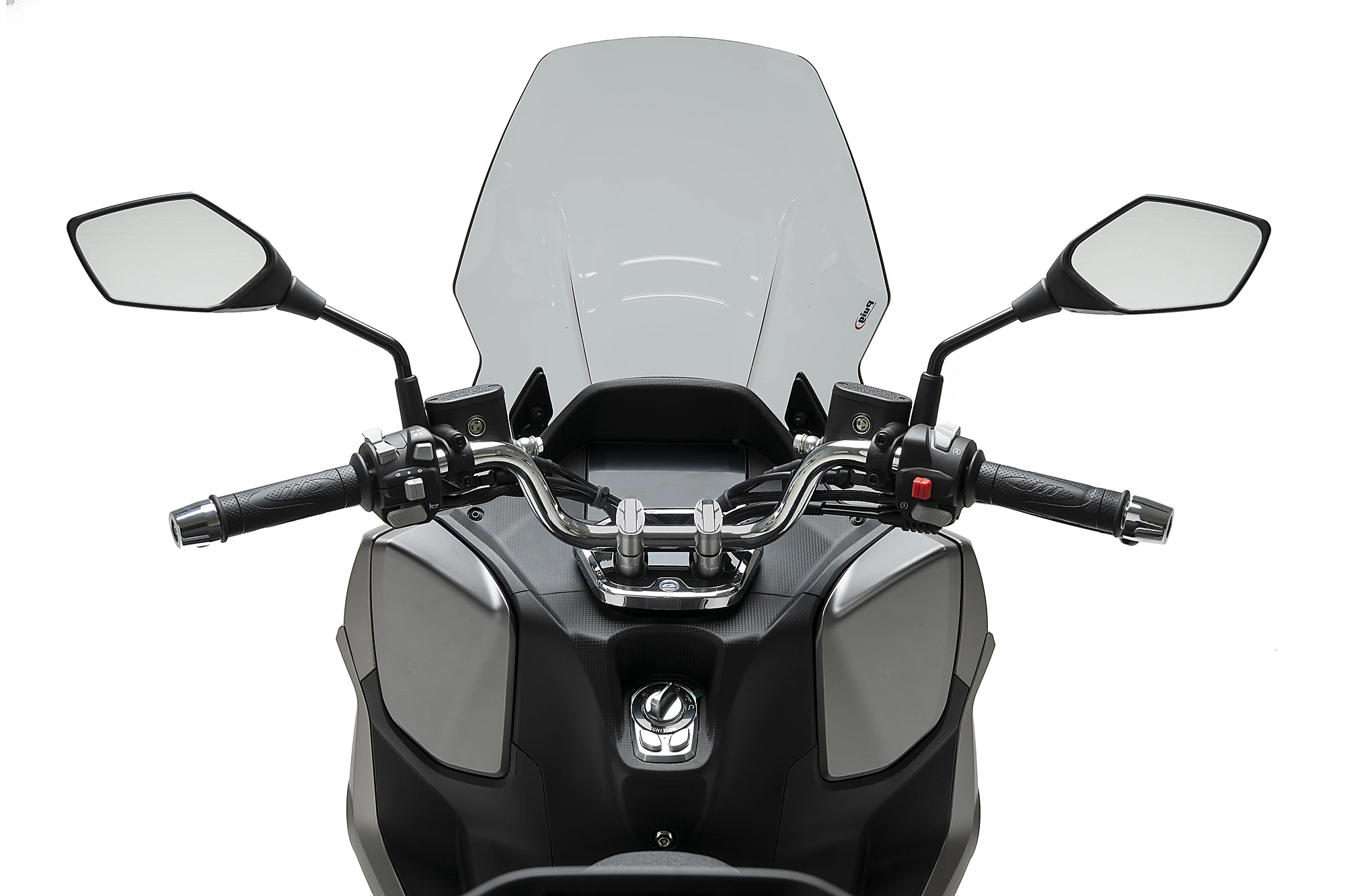 Ses dimensions généreuses en hauteur et en largeur permettent de dévier le flux d’air au niveau des mains, des bras, de la partie supérieure du torse et de la tête, améliorant le confort de conduite.