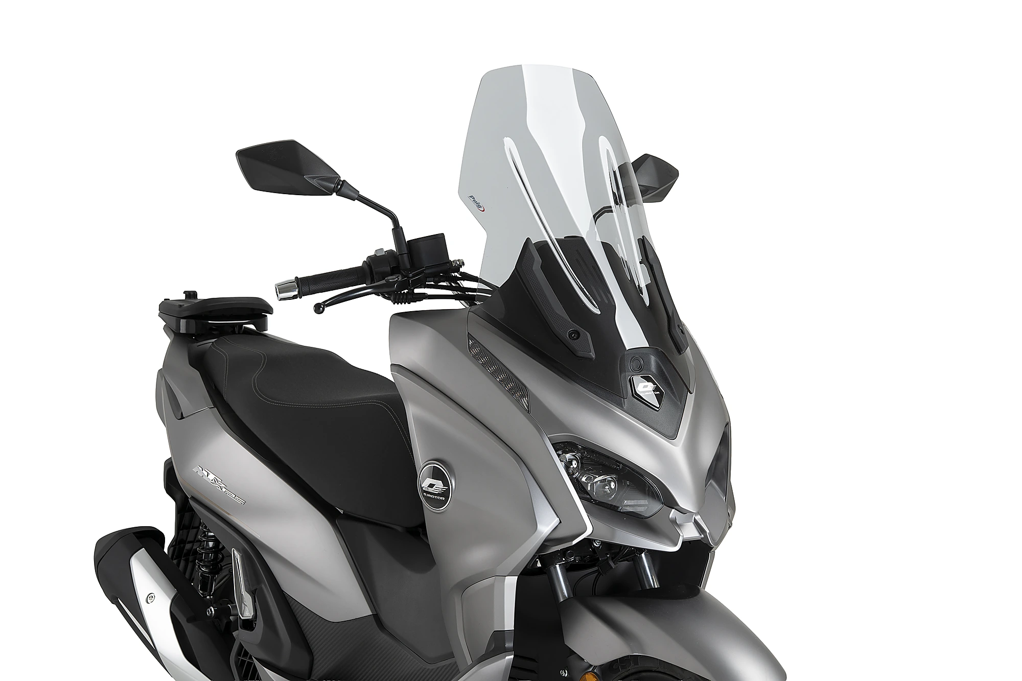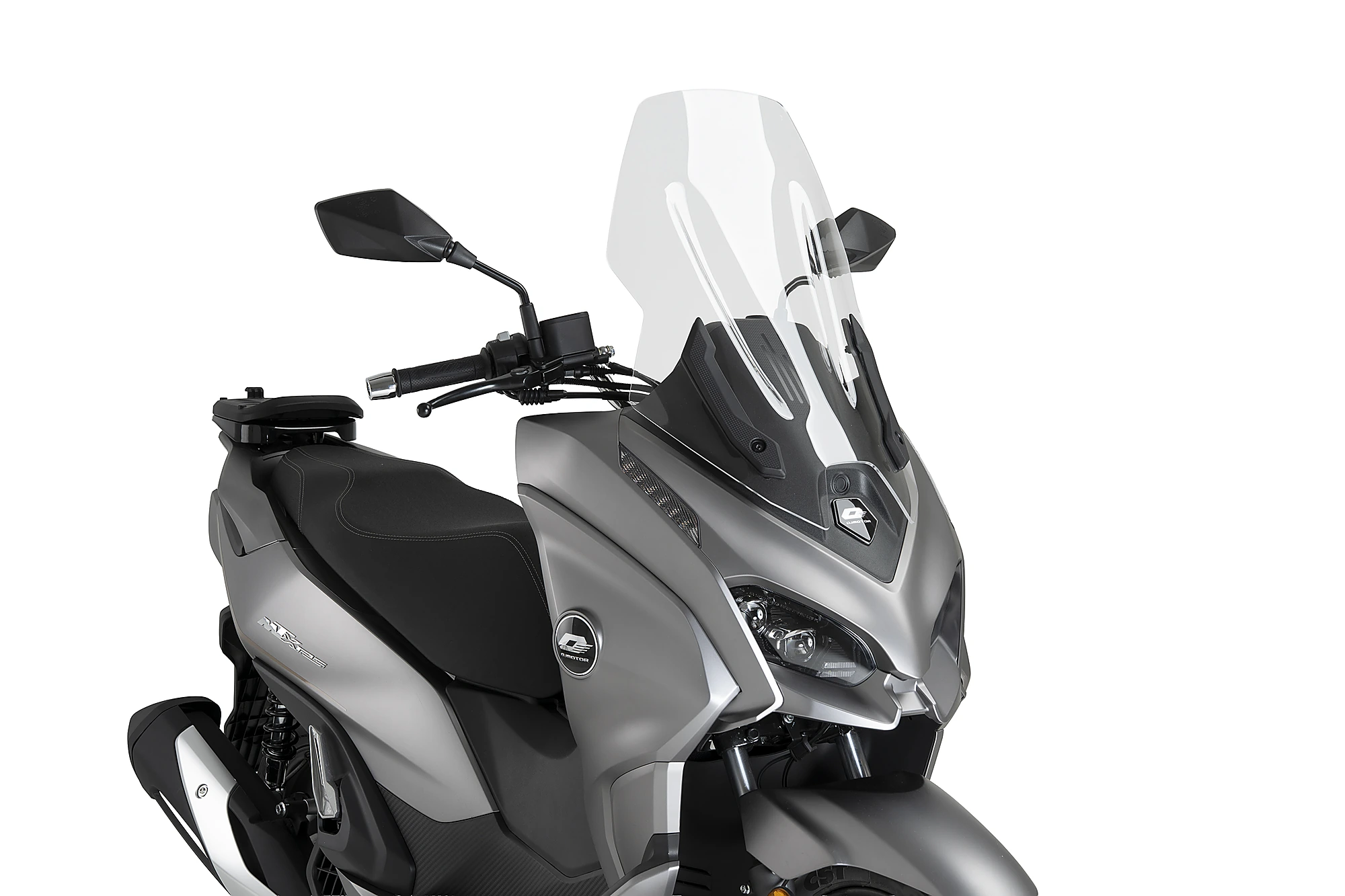 La bulle V-TECH Touring de Puig pour la QJ Motor MTX 125 25’ présente un design moderne et fonctionnel qui s’intègre parfaitement aux lignes de la moto. Son esthétique audacieuse et ses formes angulaires apportent du caractère à l’avant de la moto tout en renforçant la rigidité structurelle de la bulle.